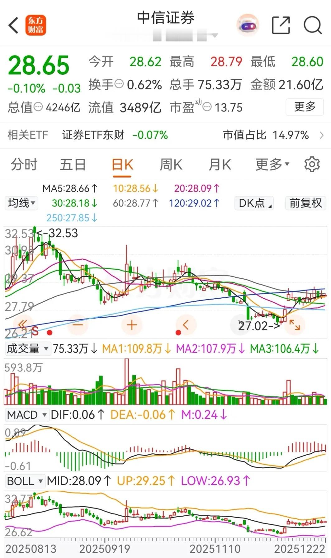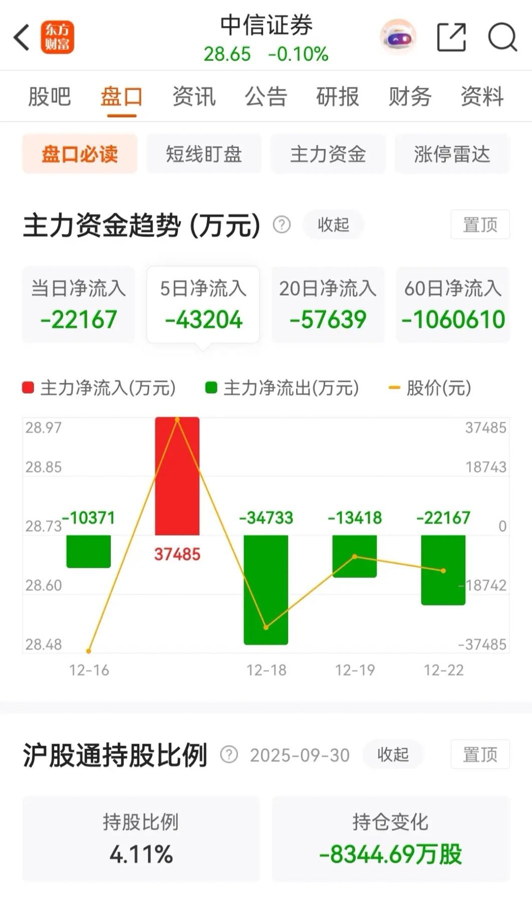 东方财富今日低开高走,收出了一颗缩量小阳星,且被主力资金净卖出。而中信证券则是低