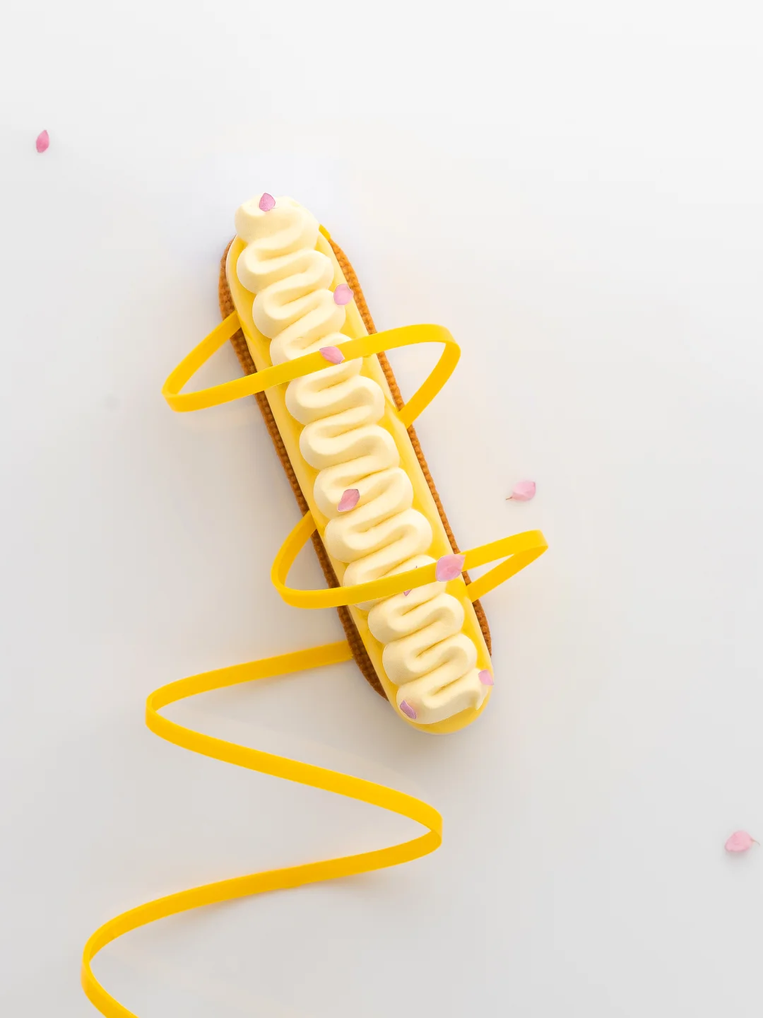 1、夹心蛋糕部分冻硬后脱模,切割成长11cm宽1.5cm的长条。