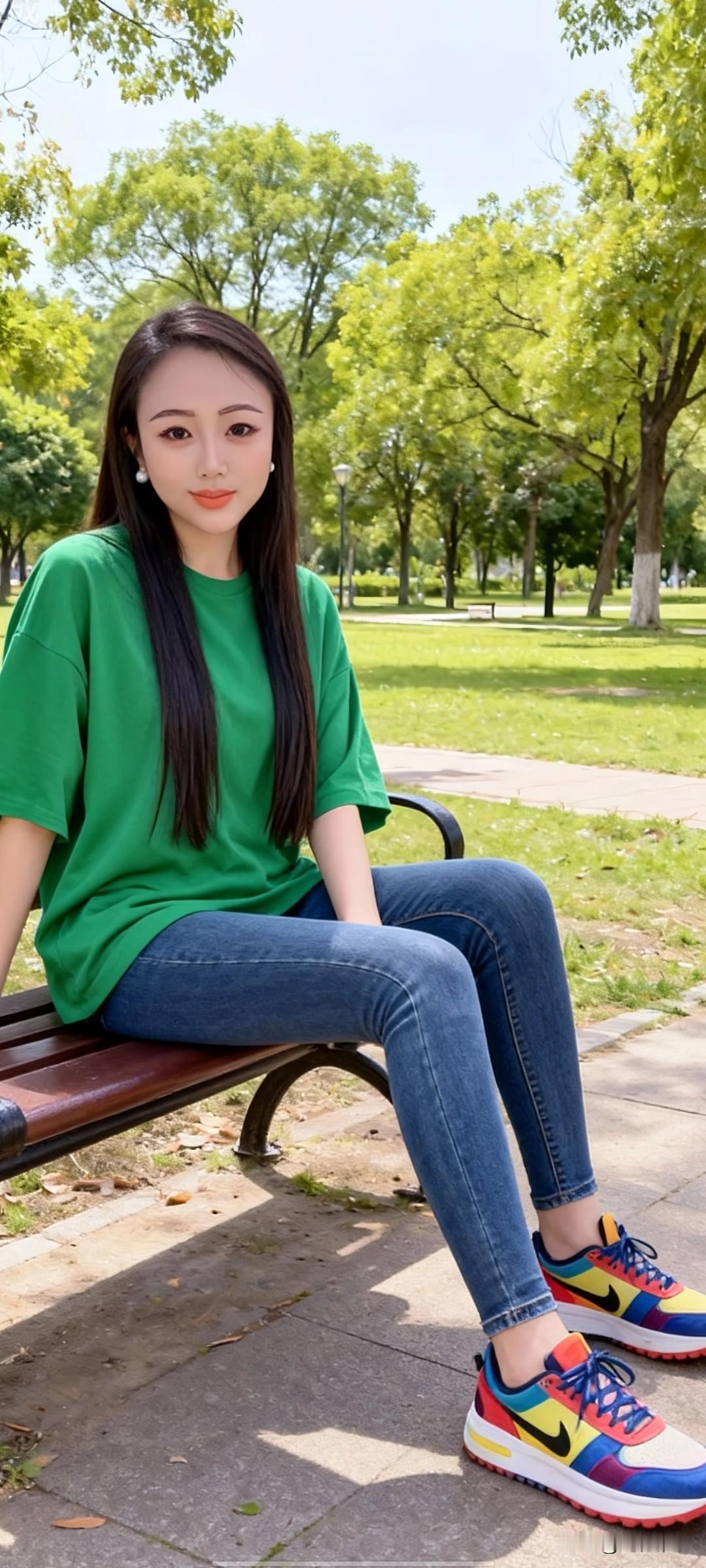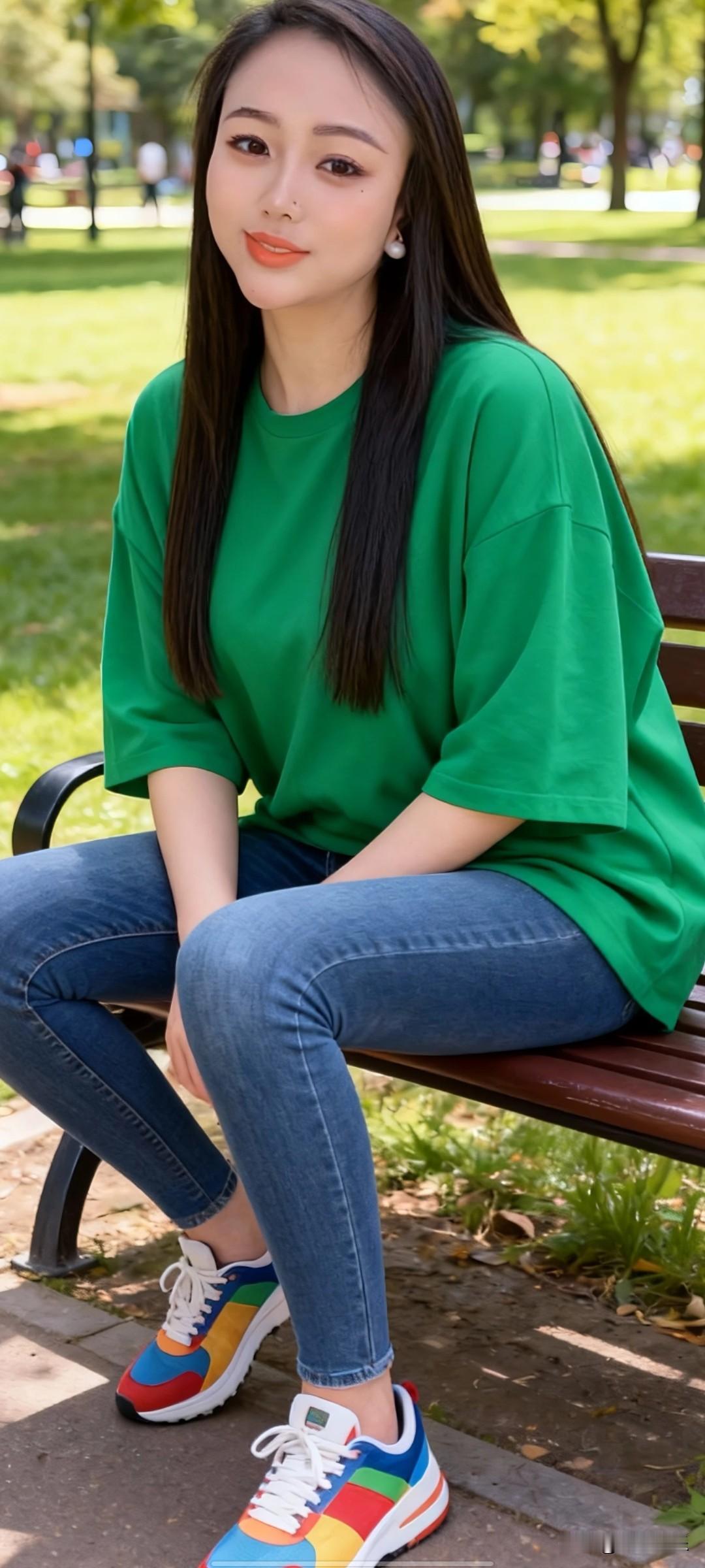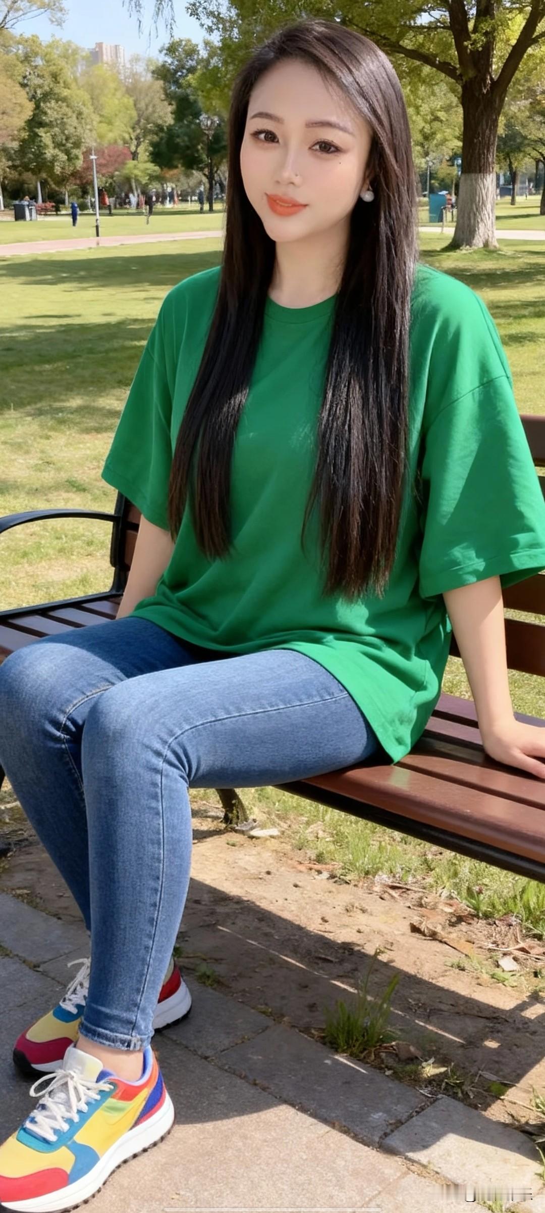 阳光明媚的午后,绿意盎然的公园里,一位少女坐在长椅上,微笑着享受这宁静的时光。