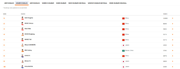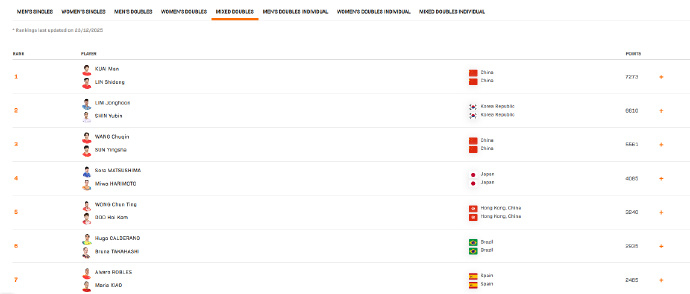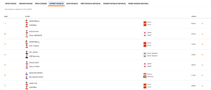 2025国际乒联第52周排名 男单赛场:王楚钦以 9925 分稳坐榜首,林诗栋紧随其后位列第二,梁靖崑排名第7,向鹏第11。女单方面:孙颖莎连续180周女单第一 孙颖莎11600分领跑,王曼昱、蒯曼、陈幸同、王艺迪包揽前五,陈熠位列第8。双打赛场同样亮眼:男双王楚钦/林诗栋第3、林诗栋/黄友政第9;女双王曼昱/蒯曼登顶第一,孙颖莎/王曼昱第 3,多对组合跻身前十。混双林诗栋/蒯曼第一,王楚钦/孙颖莎第3。