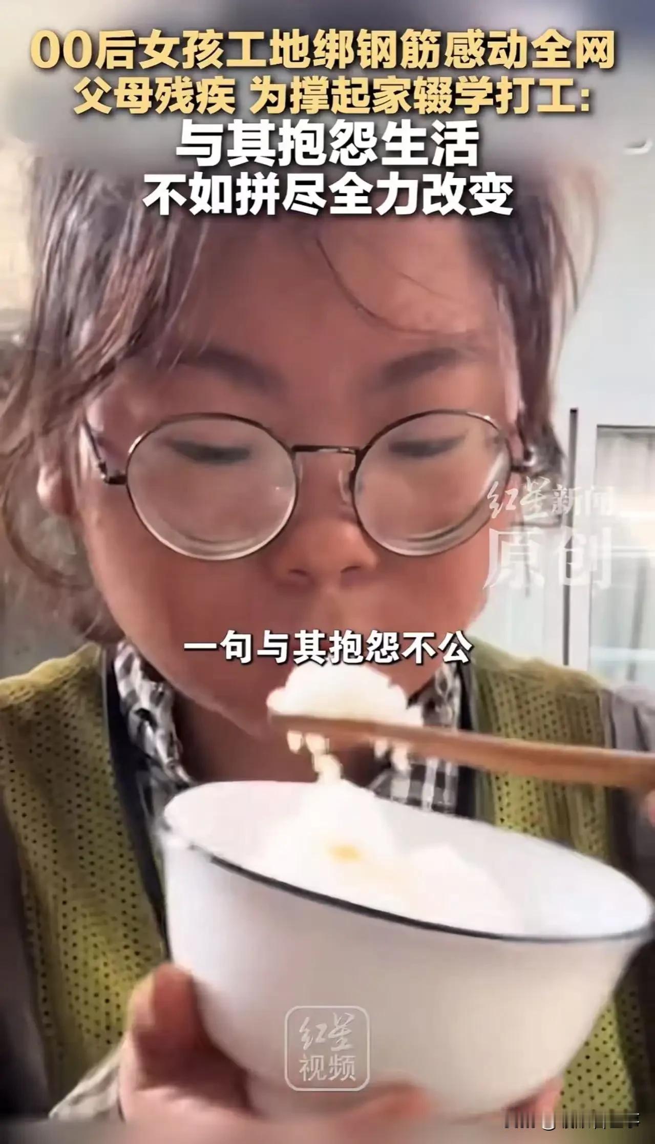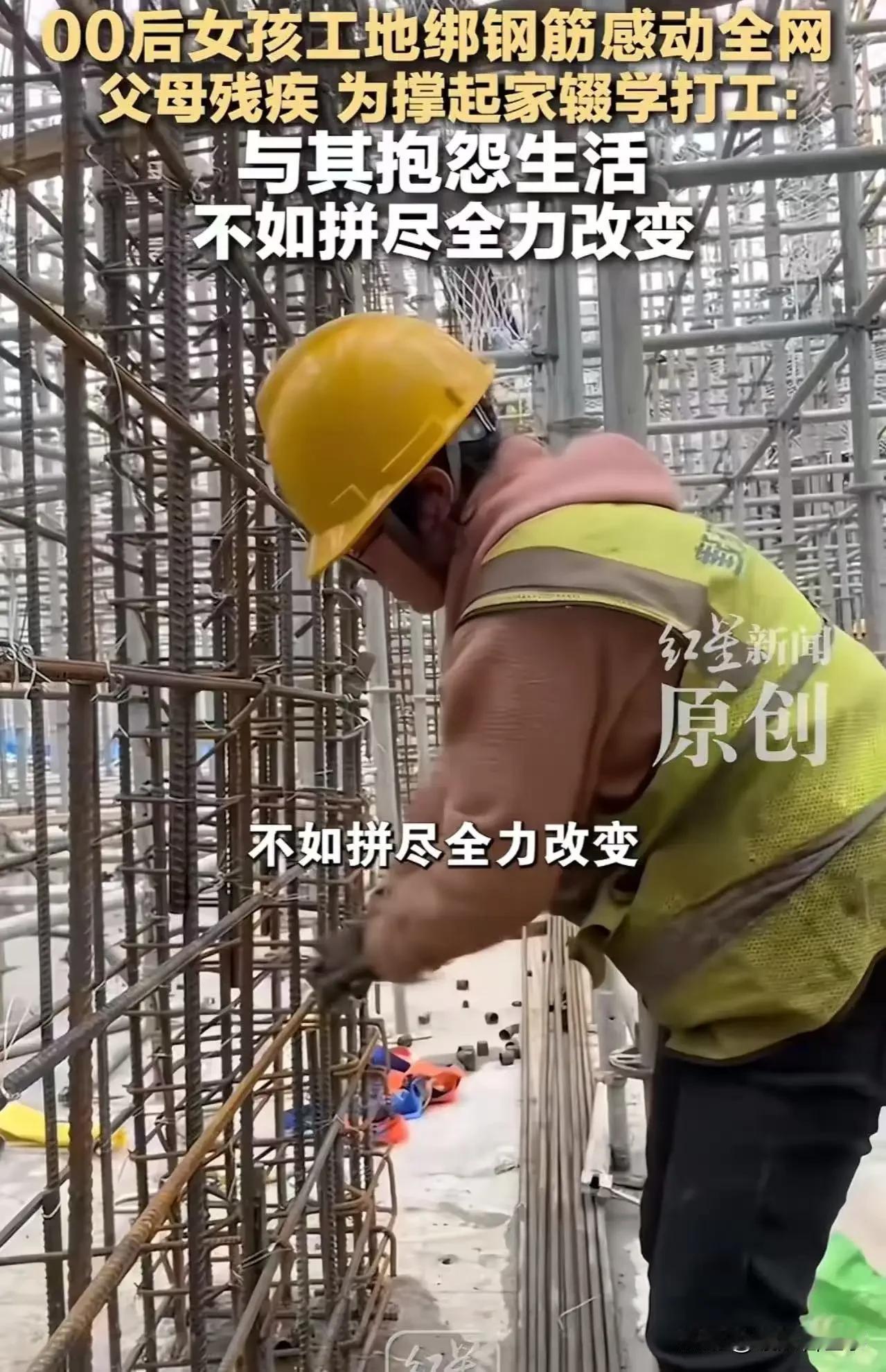 00后女孩去工地应聘绑钢筋的活,工人嘲笑她不自量力,可女孩却用实力让工头把她的日薪从200涨到320块钱,硬是把家里的担子全扛了起来!有人问女孩为什么这么拼,女孩说:“父母残疾,家里困难,与其抱怨生活,不如拼尽全力改变!” 她的眼神坚定而温暖,那份从骨子里透出的坚韧,让人不由得心生敬佩。这个世界上,总有人用行动证明了什么叫“逆风翻盘”。面对偏见和质疑,她没有选择退缩,也没有被困难击倒。相反,她用汗水和努力,写下了一段令人动容的故事。 工地上的工人们曾经笑她“不自量力”,甚至有人嘲笑她“女孩子能干啥?”但她没有在意那些冷言冷语。她知道,只有用实力才能赢得尊重。每天早出晚归,挥洒着汗水,她用一双坚韧的手,绑起一根根钢筋,用实际行动告诉所有人:性别从不是限制,梦想才是动力。 当工头看到她的表现时,惊讶、震撼,甚至带着一丝敬佩。于是,他毫不犹豫地将她的日薪从200涨到320元。这不仅是对她努力的认可,更是一份沉甸甸的责任——让这个家庭的希望重新点亮。 有人问她:“为什么这么拼?”她的回答简单却深刻:“父母残疾,家里困难,与其抱怨生活,不如拼尽全力改变。”这句话像一股清流,冲破了所有的偏见和无奈。她用行动诠释了什么叫“逆境中的坚韧”,也让我们看到了一个普通女孩背后那份不平凡的力量。 或许有人会说:“她太拼了,值得吗?”但我想说:正是这些拼搏的瞬间,才让我们看到了人性的光辉。每一个努力不懈、迎难而上的身影,都在告诉我们:无论出身如何,生活多难,只要心中有希望,就没有过不去的坎。 这个故事,像一面镜子,映照出许多像她一样的普通人。他们或许没有耀眼的光环,但用坚韧书写着属于自己的精彩。也许我们都能从她身上找到共鸣:不抱怨,不放弃,用行动去改变命运。 这不仅是一个女孩的奋斗史,更是一场关于勇气、坚持与希望的生命赞歌。在这个充满挑战的时代,让我们都学会像她一样,用拼搏点亮人生的每一个角落。因为,真正的强者,不是没有困难,而是在困难面前依然微笑前行。
