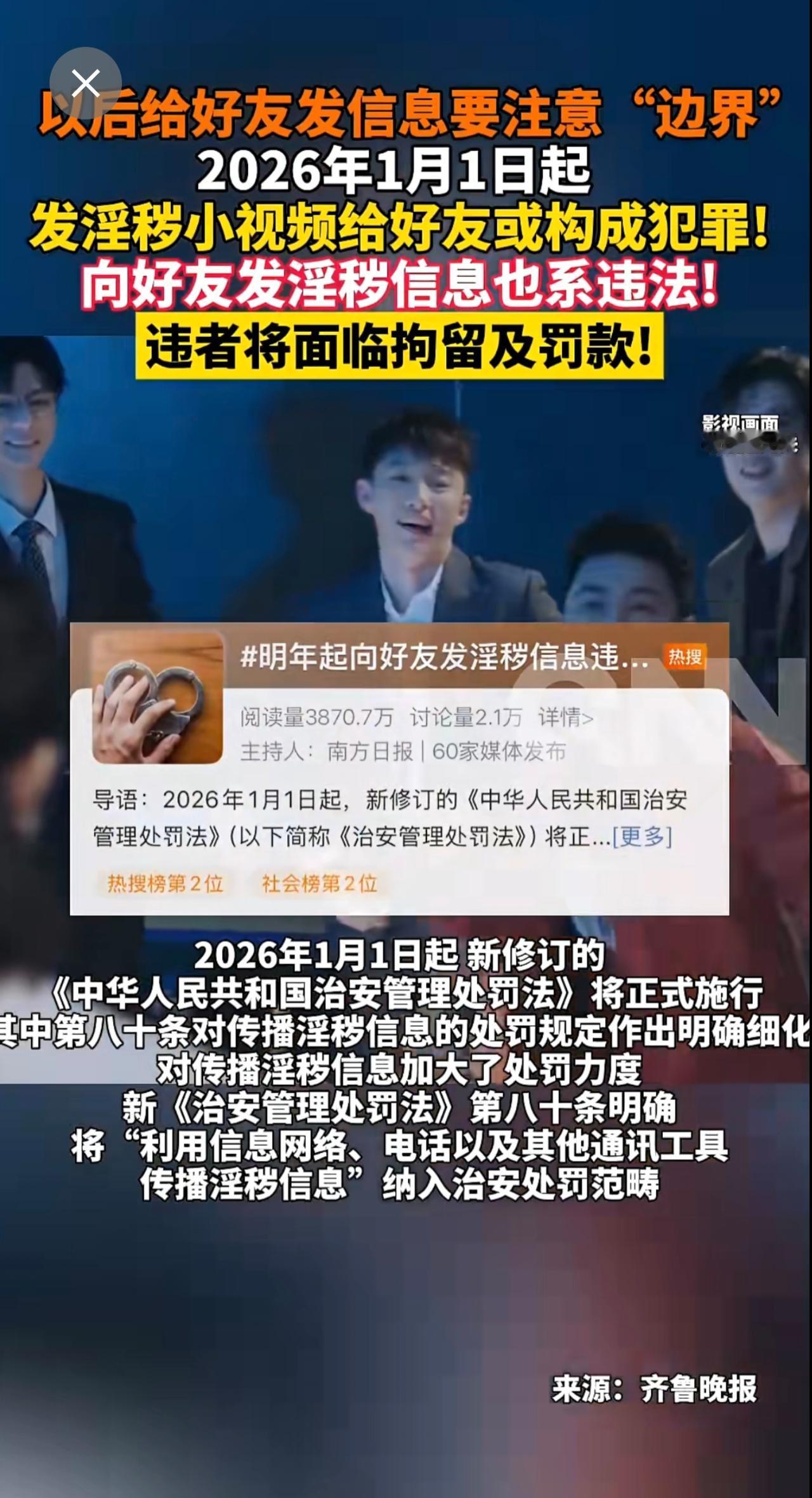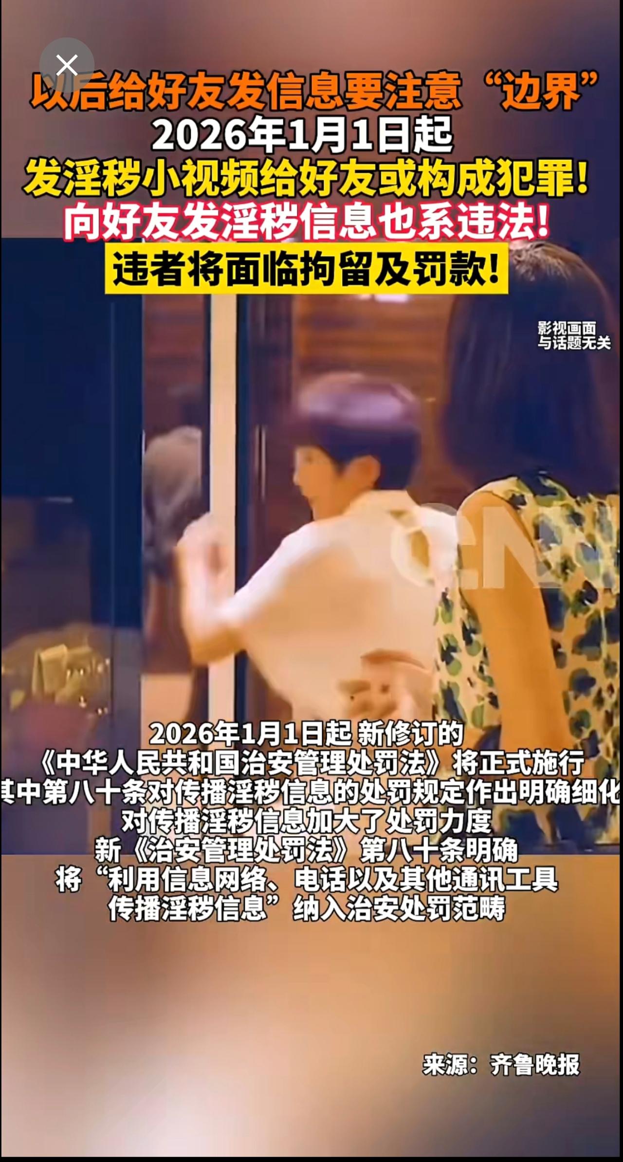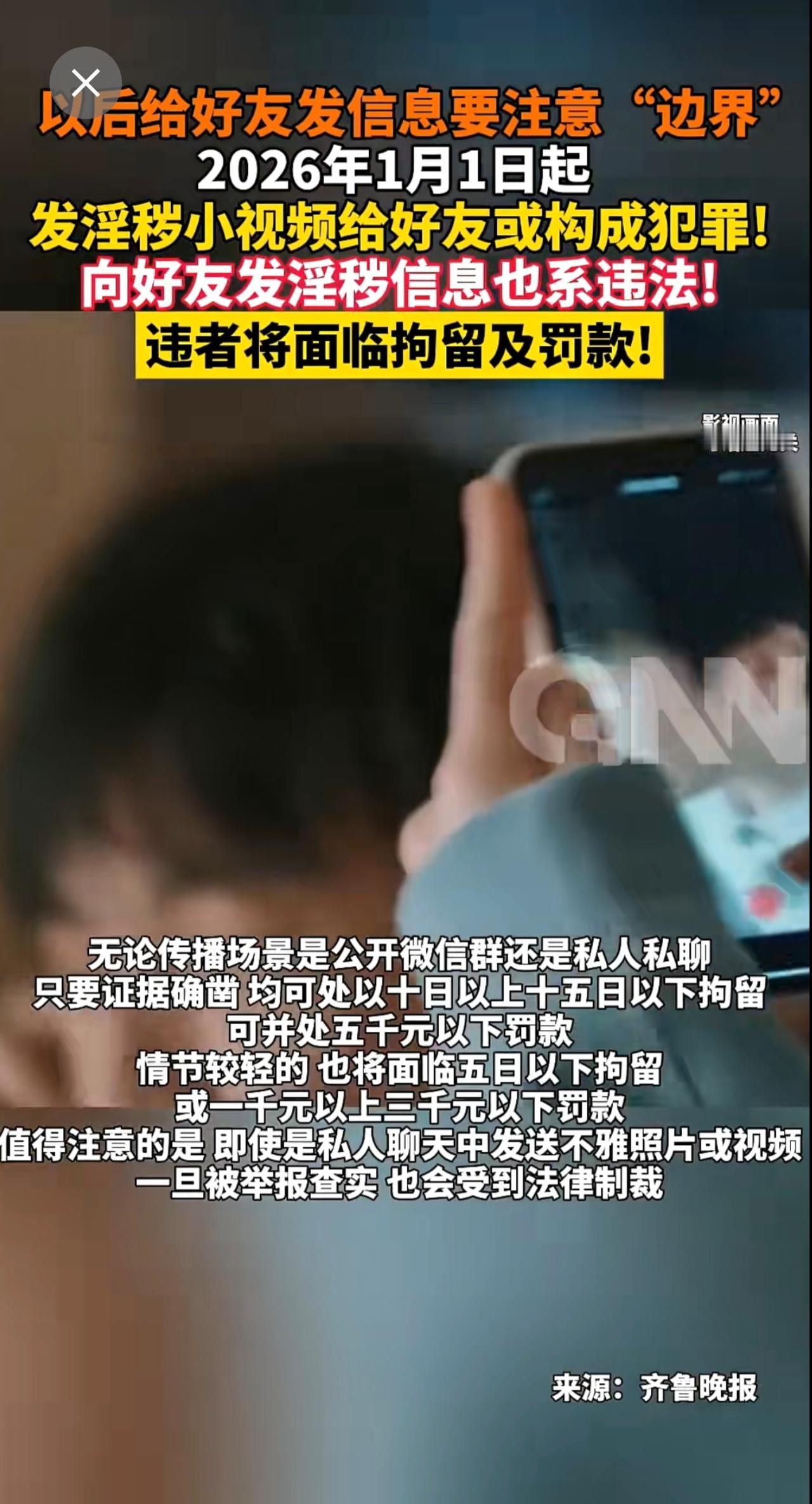 2026年1月1日起 ,发淫秽小视频给好友或构成犯罪! 向好友发淫秽信息也系违法! (视频来源,青岛新闻网)你怎么看