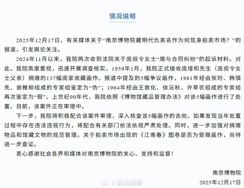终于有好消息了,国宝守护终迎强音!!国家文物局今日宣布成立工作组核查南京博物馆! 2025年12月23日,国家文物局成立专项工作组,全面核查南京博物院文物管理问题,重点聚焦鉴定程序合规性、流转链条合法性及利益输送疑点,引爆全民关注。 此次核查源于退休职工郭礼典长达17年的实名举报,直指前院长徐湖平涉嫌盗卖约10万件故宫南迁文物。举报称其指使专家将真迹伪鉴为赝品,通过兼任法人的江苏省文物商店,低价流入其子关联拍卖公司,最终走私海外牟利。 明代仇英《江南春》的离奇流转更是疑点重重。这幅1959年的捐赠名画,经徐湖平签字划拨,2001年以6800元匿名贱卖,2025年竟以8800万元估价现身拍卖行,价差超1.3万倍。徐湖平否认经手,却与调拨文件上的亲笔签名自相矛盾。 从省级调查到国家层面介入,公众期待彻查文物留存真相、争议文物流向及利益输送黑幕。文物是不可再生的历史瑰宝,唯有严查彻办,才能筑牢文化守护的防线,重建公众对文博机构的信任。