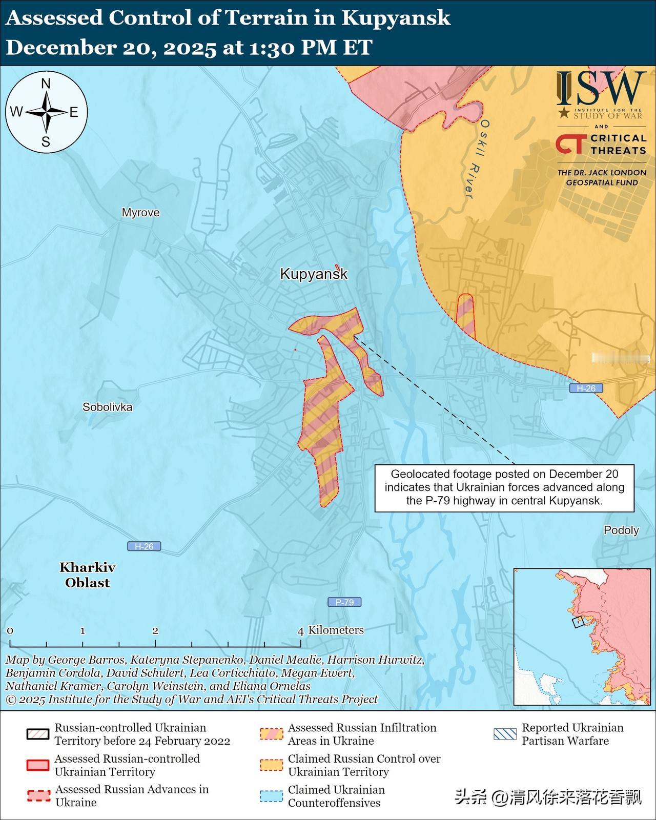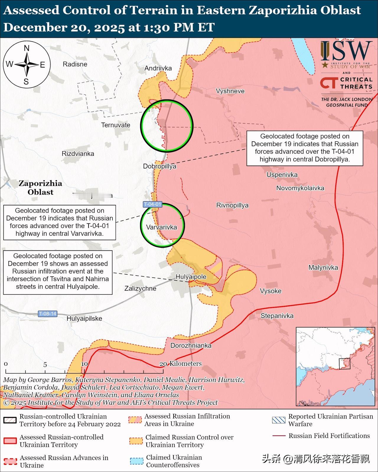 12月19日和20日,美国代表团分别在迈阿密会见了乌克兰-欧洲代表团和俄罗斯代表团。 美国国务卿马可·卢比奥重申,俄罗斯和乌克兰都必须做出妥协才能结束战争。此前,俄罗斯总统弗拉基米尔·普京于 12 月 19 日重申了他对全面战争目标的坚定承诺。 12月19日至20日夜间,乌克兰军队袭击了俄罗斯的军事和石油设施。 自 12 月 15 日以来,已有三架无人机(其中至少两架据称是俄罗斯无人机型号)进入土耳其领空或在土耳其境内坠毁。 乌克兰军队最近在库皮扬斯克附近推进,俄罗斯军队最近在胡利亚波列附近推进。