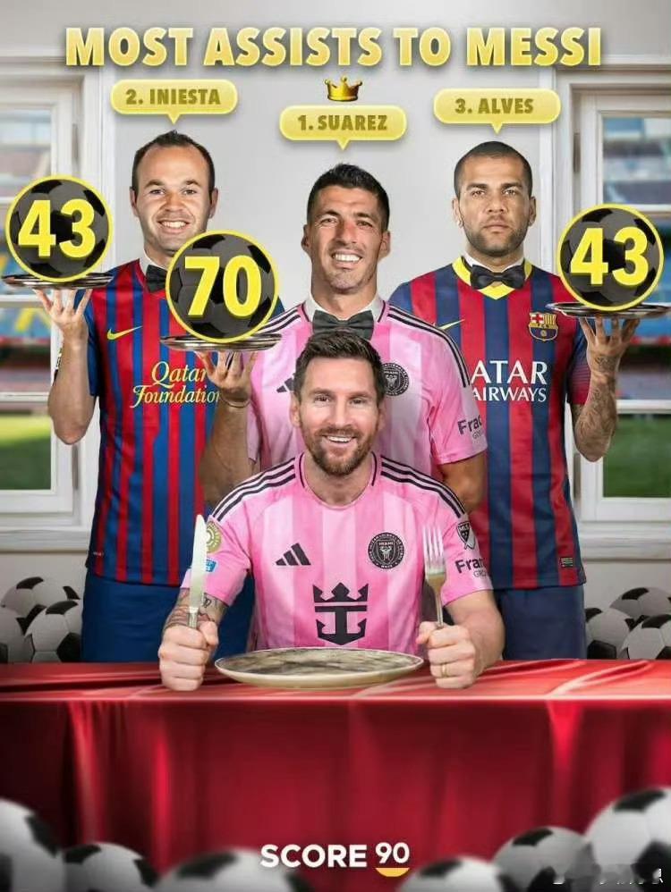 score统计,在梅西的896个进球中,他的巴萨队友为他送上助攻最多!苏亚雷斯 70次(巴萨+迈阿密国际)伊涅斯塔 43次(巴萨)阿尔维斯 43次(巴萨)在梅西407次助攻中,最大的受益者是苏亚雷斯45次