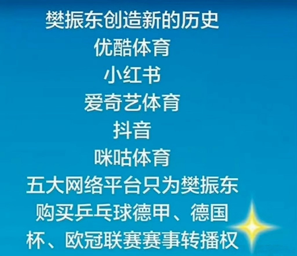 樊振东顶级影响力优酷体育、小红书、爱奇艺体育、抖音、咪咕体育五大平台,只因他加盟德甲,便集体拿下乒乓球德甲、德国杯、欧冠联赛的转播权。这在欧洲乒乓球赛事转播史上是前所未有的突破,他凭一己之力,把欧洲乒联赛事,变成了各大平台争抢的香饽饽