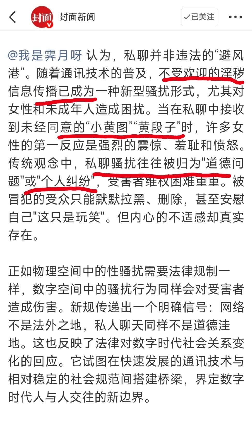 私聊不是淫秽信息的避风港说实话这个新闻稿子我看了一遍,人有点懵逼,我看你们这文章的意思,这什么私聊发淫秽信息违法的问题,其实是为了防止所谓女生私信被骚扰的情况整出来的创造性解决措施???合着你们这真实目的是,女生投诉自己私聊被性骚扰了以后就当有人发淫秽信息从重处理???这到底是法律的意思,还是你们小编自己找的什么人自己的意思???