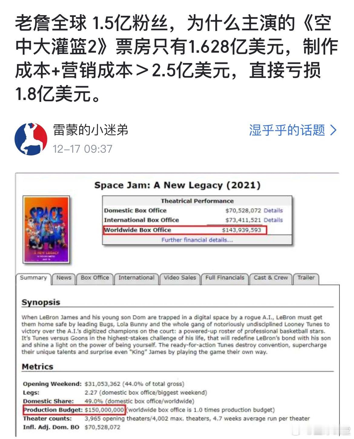 球迷提问:老詹全球 1.5亿粉丝,为什么主演的《空中大灌篮2》票房只有1.628亿美元,制作成本+营销成本>2.5亿美元,直接亏损1.8亿美元。