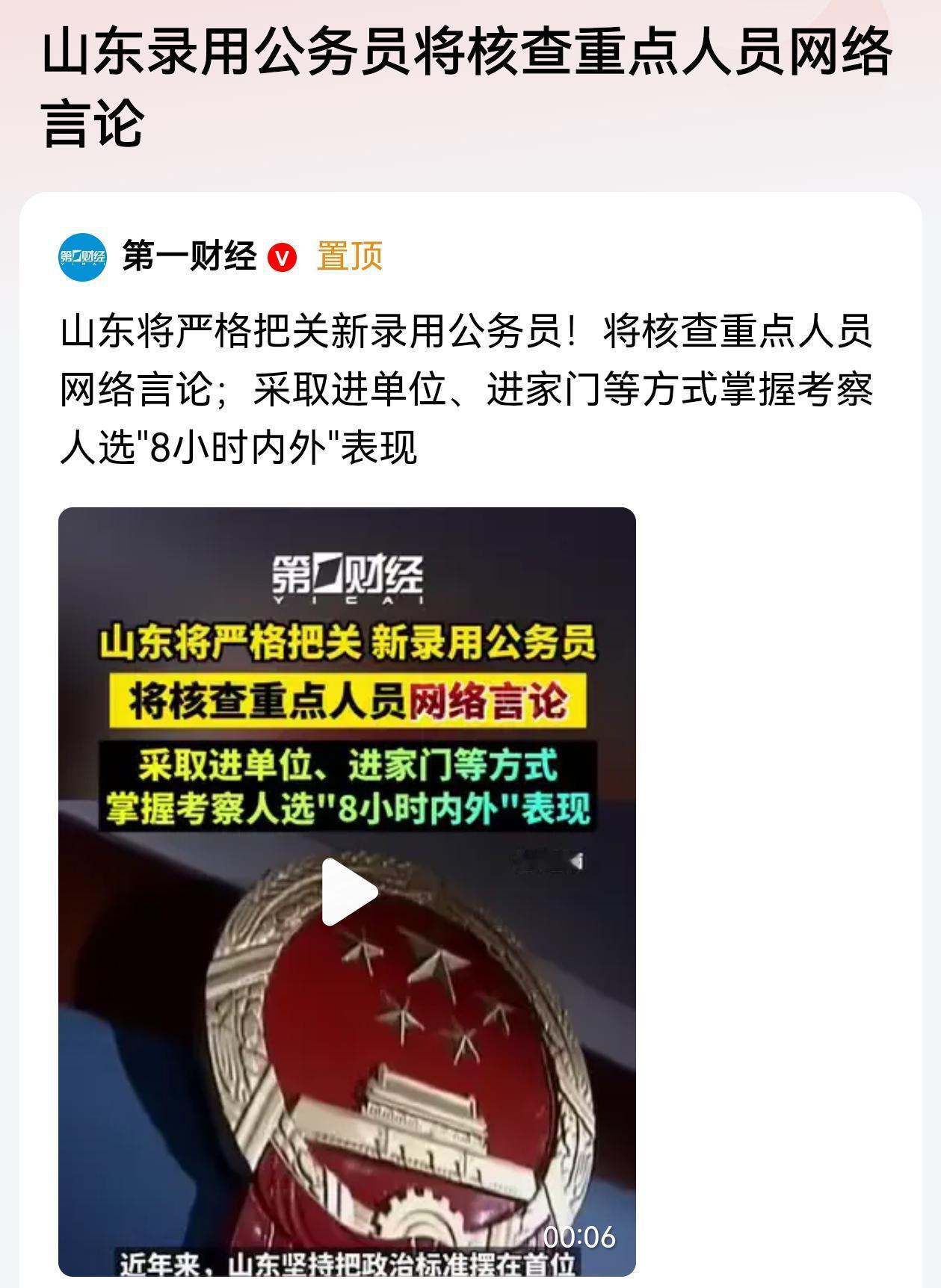 山东录用公务员将核查重点人员网络言论! 那么一些人的网络账号是不是应该加强监控,该销号的销号,一些关键账号信息该要公示的就公示,让人民群众切实参与到平常的监督管理中,作为一个公务员,真心为老百姓做实事,说真话更重要。 如果再能透明化一些,公布净资产可能效果更好