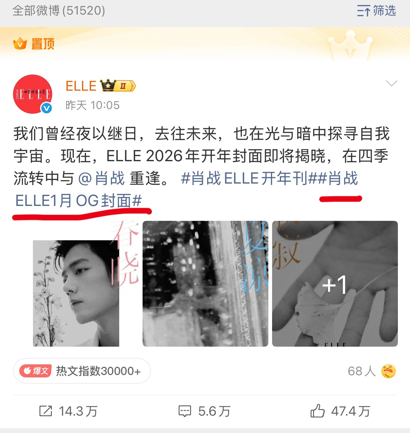 咖位高,待遇好就是像肖战这样,平台品牌自己直接带词条官宣明星地位,粉丝直接被带飞。肖战压轴官宣东方卫视跨年肖战ELLE1月OG封面