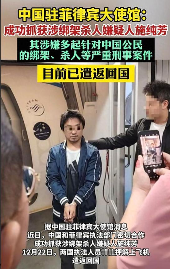 /有些人,唐僧见了都得起杀心。 施纯芳在菲律宾,专干一件事,绑架同胞,并且不讲武德,拿到赎金还要撕票。江湖有江湖的规矩,连这点规矩都没有,枉来世上这一趟。如今已落网,并押送回国。 这个施纯芳,四十出头,福建晋江人,在菲律宾华人圈里曾是个“有头有脸”的人物——菲律宾中国商会黎刹省分会创会会长。 白天的他,西装革履穿梭在各种华人社交场合,张口闭口都是“服务同胞”“促进合作”,俨然一副热心公益的侨领模样,不少刚到菲律宾打拼的中国商人、投资者,就是冲着这份“同乡情谊”对他放下了戒心。 可谁能想到,这副人模狗样的皮囊下,藏着一颗专坑同胞的黑心,夜幕一降,他就成了操控犯罪网络的绑匪头目,那些信任他的同胞,在他眼里全是待宰的羔羊。 他的套路很固定,要么以“商会会长”的身份主动搭话,要么冒充生意伙伴抛出合作诱饵,等受害者放松警惕后,就带人把人绑走,接着向家属漫天要价勒索赎金。 最丧心病狂的是,不管家属是不是凑齐赎金,他大概率都会撕票,手上攥着多起针对中国公民的绑架杀人案,每条人命背后都是一个破碎的家庭。 就这种连同胞都下死手的主,别说江湖规矩了,连最基本的人性都没有,唐僧对吃人的妖怪都能劝一句回头是岸,对这种披着侨领外衣的恶狼,估计只剩厌恶。 从2023年起,中国警方就已经通过国际刑警组织对他发出了红色通缉令,还联合多个国家的执法机构共享情报追查他的下落。 可这家伙反侦察意识挺强,在菲律宾多次伪装身份,一会儿扮成贸易老板,一会儿又装成投资人,躲在华人聚集区里藏得很深,这一躲就是两年多,期间好几次线索都断了,办案人员愣是没放弃,一点点摸排梳理,才终于锁定了他的落脚点——菲律宾黎刹省的一栋高档别墅。 这次能把他顺利抓住,全靠中菲两国执法部门的联手配合,前期准备就做了好几个月,不光用无人机全程监控他的作息,防止他偷偷跑路,还提前启动了反洗钱调查,直接冻结了他在菲律宾三家银行的账户,断了他转移资产的念想。 抓捕当天更是干脆利落,从冲进别墅到控制住施纯芳,前后不到15分钟,他当场没敢做任何反抗,估计也知道自己这次是真的跑不掉了,之前那股子作威作福的嚣张劲儿瞬间垮了,只剩满脸惊慌。 2025年12月22日下午,施纯芳被两国执法人员正式押上从马尼拉起飞的航班,遣返回国。 中国驻菲律宾大使馆当天就发了消息确认这件事,明确说施纯芳涉嫌多起绑架、杀人等严重刑事案件,这次行动是中菲联手打击跨国犯罪的重大成果。 消息一出来,不少在菲打拼的同胞都松了口气,毕竟这两年菲律宾针对中国公民的绑架案不算少,仅2024年1到5月就发生了18起,大部分受害者都是中国人,还有菲律宾败类警察掺和其中形成犯罪链条,搞得人心惶惶。施纯芳这个头目落网,总算能让人稍微安心点。 这次施纯芳落网,不只是抓了一个罪犯那么简单,更像是给那些想跑到国外祸害同胞的不法分子敲了个响亮的警钟。 之前总有些人心存侥幸,觉得海外是法外之地,专挑同胞下手,觉得跨国破案难就能为所欲为,现在施纯芳就是最好的例子,不管你身份伪装得多好,藏得多深,国家都有本事把你揪出来。
