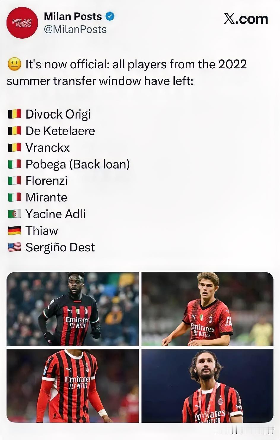 全军覆没!米兰2022年夏季窗口引进的球员已经全部离开俱乐部,最近三年时间教练与队员更迭过于频繁,这是球队成绩起伏的主要原因,好在阿莱格里来了算稳住了局面。 严格来说当年也就德卡克莱尔属于是潜力股,其他都是彩票,帝奥属于踢出来卖出价格,后卫层面队长严选还是有保障的,剩下的彩票没刮出来原因是多重的,但这些球员除了奥里吉米兰基本没有亏损,都卖出了当年引进的价格,至少账面上摊销不是亏损,只能说好的体系对球员而言至关重要,今天看到巴特萨吉身价大涨,被很多俱乐部所关注充分说明了好的体系下彩票是能有惊喜的。 最近几年咱们钱是真的没少花,买的球员貌似都不尽如人意,哪怕是阿莱格里他也用不明白希门尼斯与恩昆库,菲尔克鲁格和那个科斯蒂奇也许下半赛季能给我们带来惊喜,希望他们表现出色,稳住局面,联赛前四绝对是可以接受的结果。