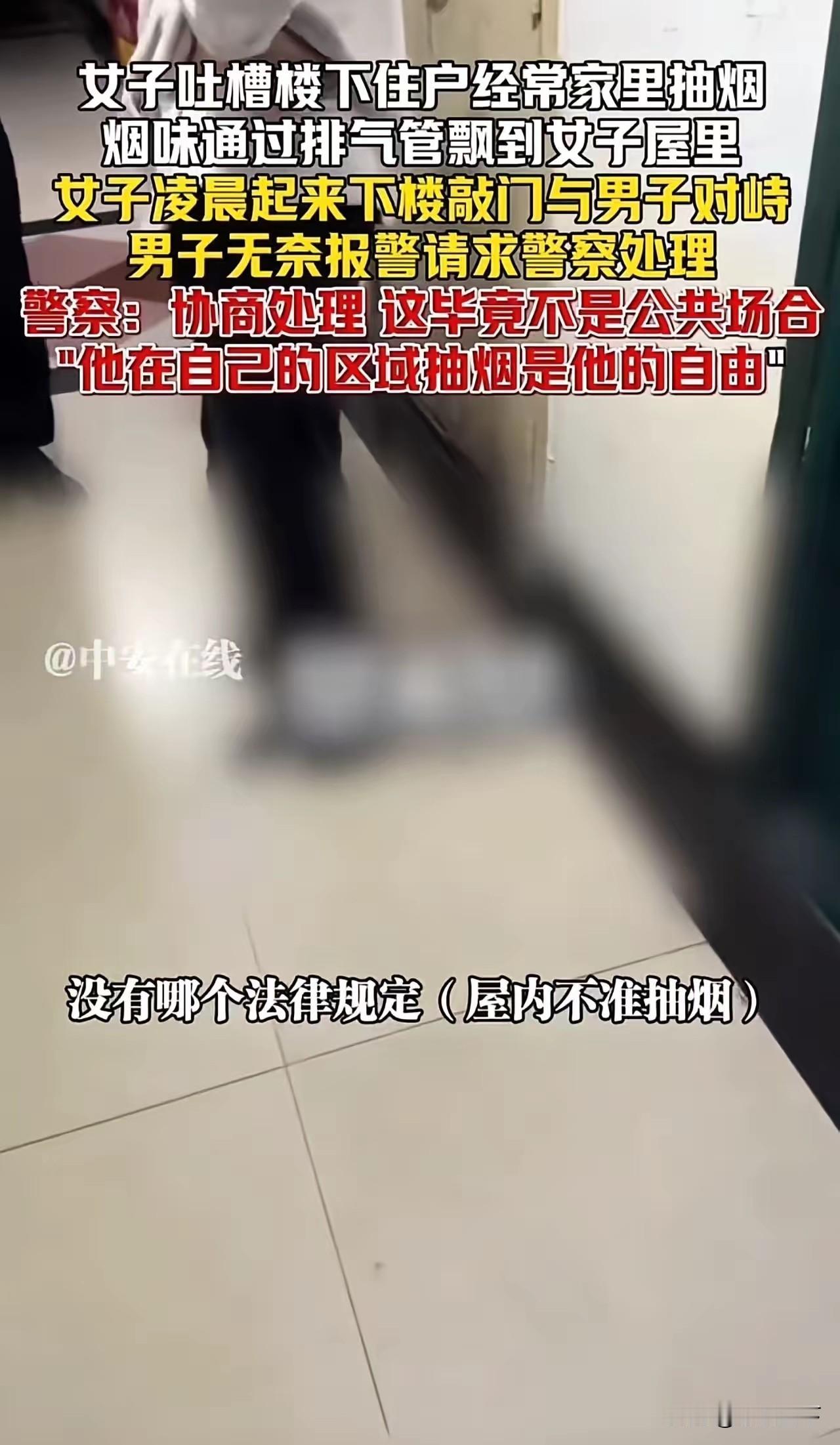 四川,男子在自己家里抽烟,楼上女邻居下来敲门,让男子不要抽了,说烟味通过排气管飘到她家里来。楼上男子都懵了,自己在家里抽烟,女子还能管的着?于是男子让女子报案,可民警来了以后,让女子傻眼了! 民警进门后没急着断对错,先俯身摸了摸男子家厨房的排气管,又给两人科普起了邻里通风管道的连通原理。原来这栋老楼的排气系统是串联设计,男子家的油烟和烟味,会顺着管道缝隙往上蹿,直接灌进楼上邻居家。 “在家抽烟是你的权利,但权利不能越界,影响到别人的正常生活就不是小事了。”民警的话让男子瞬间红了脸。他想起自己家孩子总说楼上飘来饭菜香,这下才懂,原来管道里的味道是双向流动的。 而女邻居更是愣住了,她本来做好了吵架的准备,没想到民警没指责男子,反而先给她支招:“遇到这种情况,先好好沟通,远亲不如近邻,没必要闹僵。” 最后男子主动道歉,还买了个止回阀装上,笑着说:“以后抽烟去阳台,再也不麻烦邻居了!” 一场邻里纠纷,没吵没闹就解决了。其实很多时候,矛盾的根源不是对错,而是换位思考的缺失。你以为的“自家事”,可能正悄悄影响着别人的生活;而看似“多管闲事”的提醒,背后藏着的是无奈的困扰。