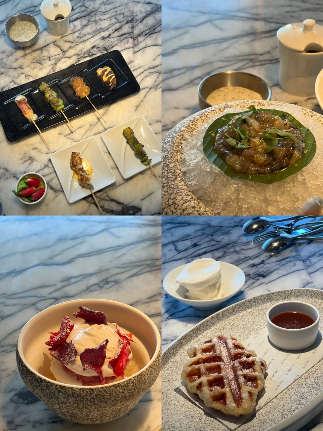 和姐妹们打卡了新晋法餐Clarence 由前米其林餐厅主厨Olivier Elzer执掌 餐厅位于H Code 25楼 可俯瞰大馆 晴天时很漂亮 店内还有一个私密性很好的雪茄区 - 餐厅主打yakifrenchy 将法餐与日式串烧融合 但味道一般,鸭肉好咸 除了串烧其他的菜都还不错 特别是其主菜魔鬼鱼 总体来说性价比还是挺高的 - 🍽店名:Clarence ⏰时间:12:00-14:30,18:00-22:00 💰价格:人均1300元 📍地点:香港中西区中环砵甸乍街45號H Code25樓 -