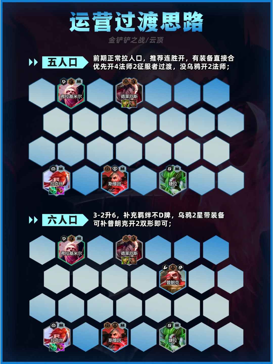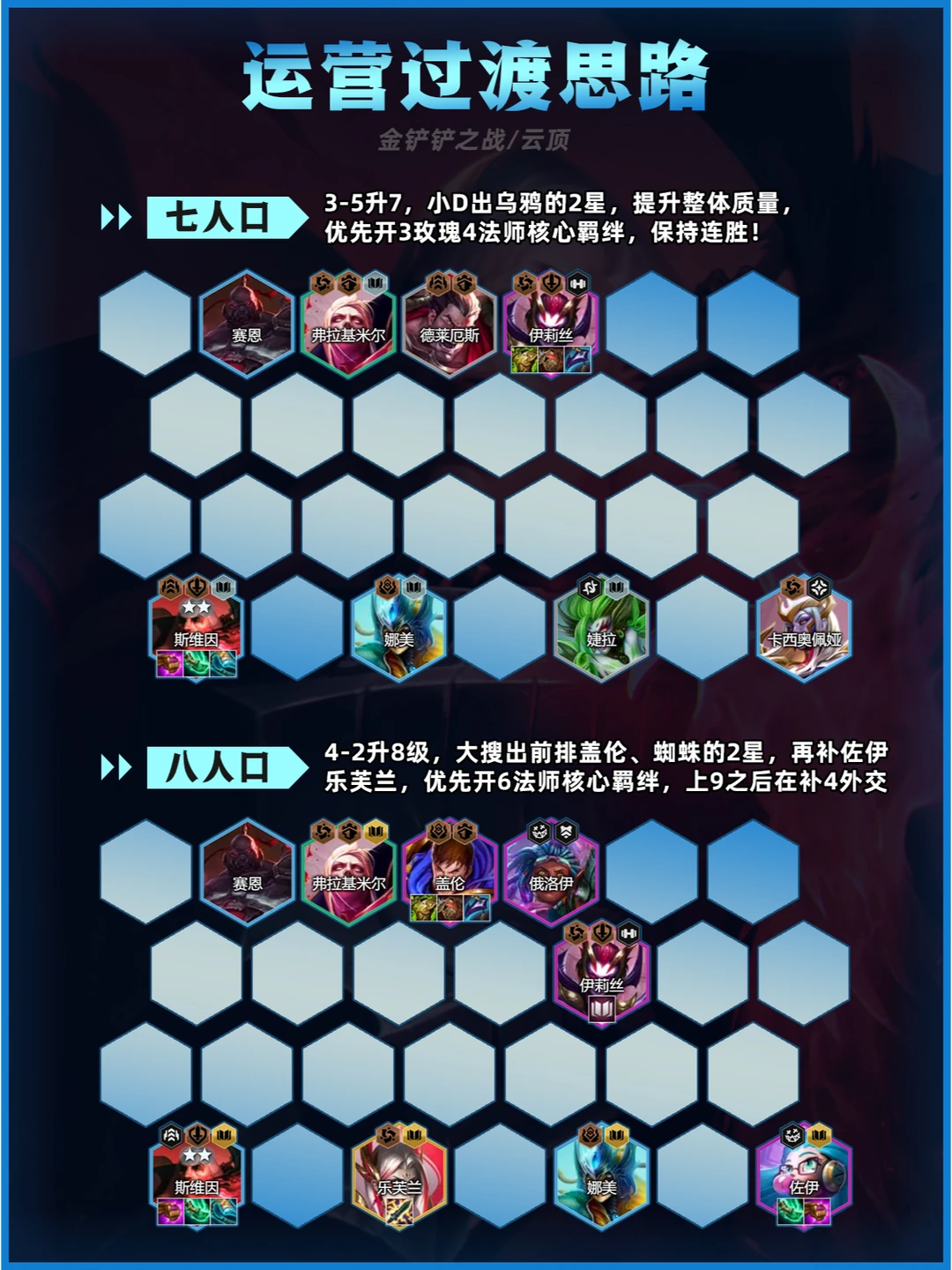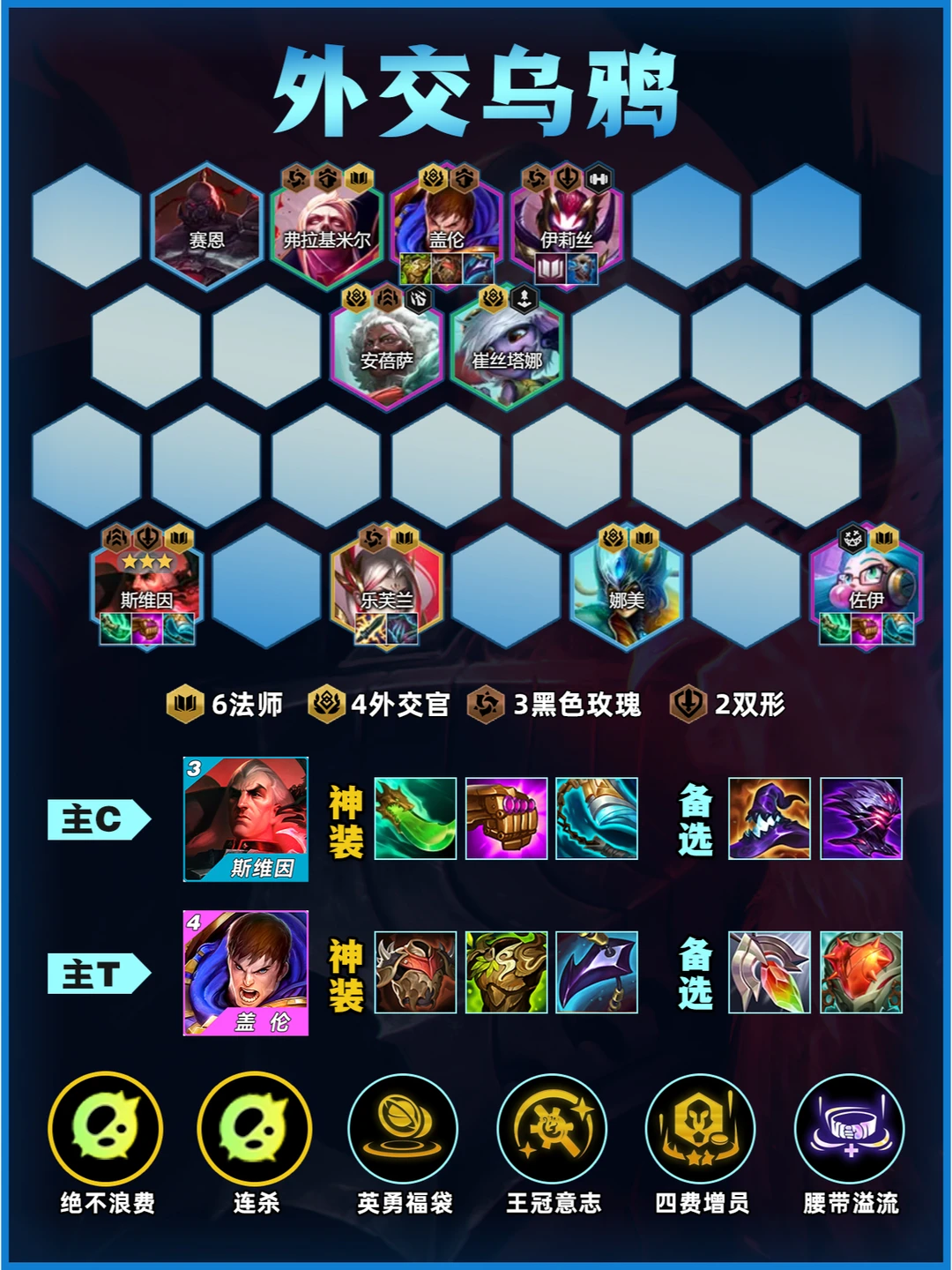 今天分享一套当前版本超火的外交乌鸦阵容!成型必吃分, 操作简单易上手,手残党也能轻松驾驭!快艾特你的开黑姐妹学起来~✨ 🌟一、阵容核心构成 主C乌鸦+主坦盖伦,羁绊拉满性价比超高! 👉 英雄搭配: 斯维因(乌鸦)、崔丝塔娜、弗拉基米尔、娜美、伊莉丝、盖伦、安蓓萨、佐伊、乐芙兰 👉 羁绊效果: 4外交官|6法师|3黑色玫瑰|2铁血征服者|2双形战士 (灵活凑羁绊,后期可补高费卡提升上限) 🛠️二、装备优先级 主C乌鸦:青龙刀(启动核心)+法爆(爆发必备)+破防(后期无敌) ✨ 替代装:电刀/巨杀(针对前排)/头盔(启动必备) 主坦盖伦:狂徒(血量翻倍)+反甲(肉装多多) ✨ 副C佐伊:捡剩余法强装(法爆+青龙刀) 📈三、运营节奏(划重点‼️) 1️⃣ 前期过渡: 用【4法师+2征服者】打工(德莱厄斯带肉装),保血量速升人口! 2️⃣ 中期发力: 4-1或4-2阶段冲8级,大搜抢乌鸦&盖伦,凑齐4外交+4法师! 有法转优先开6法师,没有盖伦先用蜘蛛做主坦! 3️⃣ 后期变阵: 8级追2星乌鸦+盖伦,有经济上9补乐芙兰,三星乌鸦直接锁血! (同行多可提前抢牌,血量低优先保质量) 🌈四、强化符文推荐 T0选择:耐心学习(经验加速)、纷乱头脑(经济神技)、D个痛快(搜卡必拿) 次选:天降金币、团队建设(追三星必备) 异常突变:乌鸦选【绝不浪费】、盖伦选【坚不可破/壁垒】 🎯五、站位技巧 盖伦顶前排:单顶吃伤害,搭配日炎减疗 乌鸦缩角:后排两侧防刺客,青龙刀快速启动 乐芙兰:侧翼切入打AOE 💡六、优缺点分析 ✅ 优点: 成型快,三费卡易追三星 双C输出爆炸,盖伦坦度逆天 版本冷门,同行少易成型 🚀七、实战小Tips 开局抢大剑/眼泪,优先合青龙刀! 经济类海克斯优先拿,速8级是关键! 乌鸦3星>强行上9,吃分稳如老狗! 后期选秀拿铲子可转【6法师】质变!