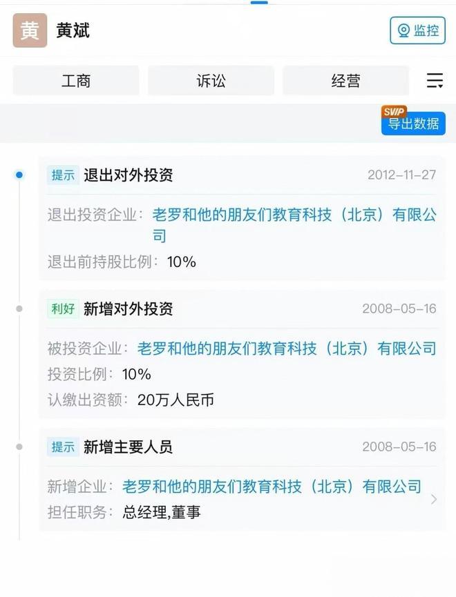 天眼查显示,黄斌在2008年5月投资“老罗和他的朋友们教育科技(北京)有限公司”,占股10%。在2012年退出该公司。目前,该公司于2017年3月注销。