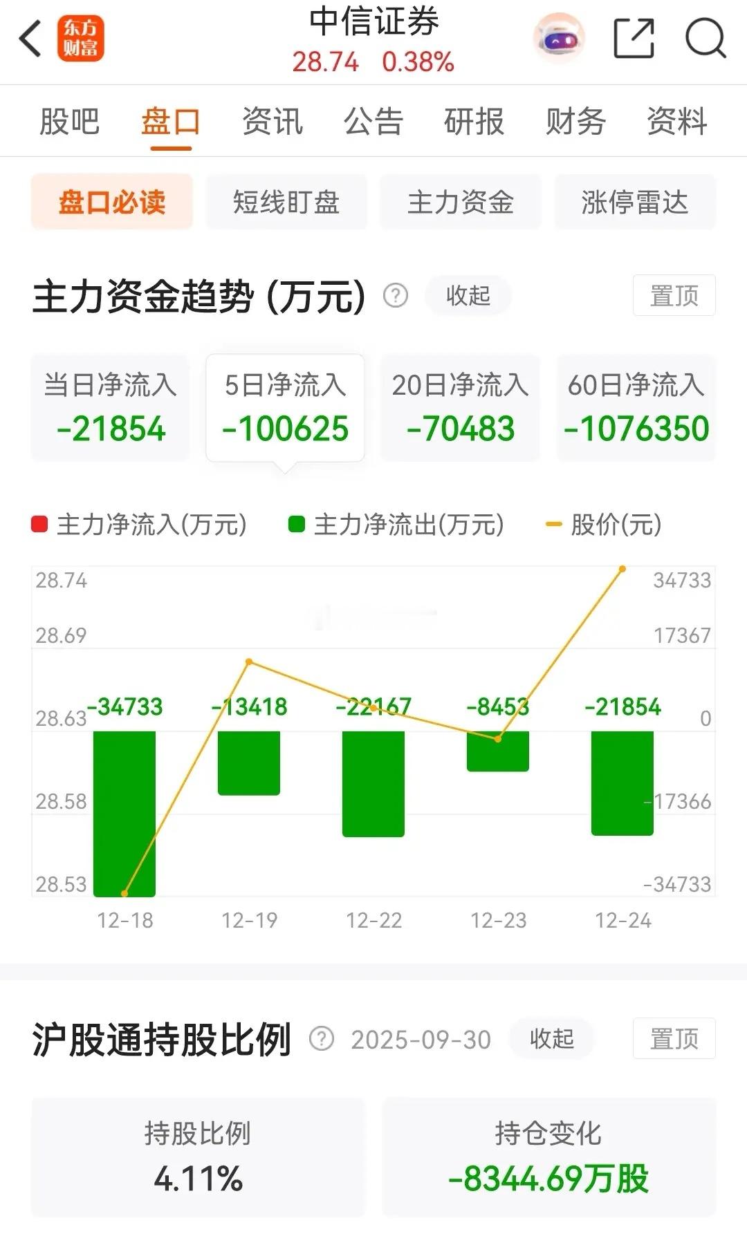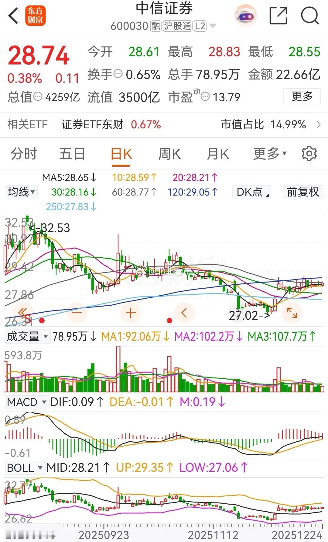 东方财富和中信证券今天低开高走,分别上涨了0.78%和0.78%,其中东财被主力资金净卖出0.9479亿元,而中信证券则是被主力资金净卖出2.1854亿元。东方财富今天早盘低开后震荡整理,到了下午时突然异动拉升,冲高后小幅度回落,最终收涨0.78%,收盘报价为23.20元。在资金流向上,目前是连续三天被主力资金净卖出,今天的净卖出金额为0.9479亿元,近五个交易日则是被主力资金合计净卖出了8.9775亿元。从整体走势上看,目前依然是在低位横盘。中信证券今天的走势同东方财富有些相似,早上低开后震荡整理,午后小幅冲高后回落,最终收涨0.38%,报价28.74元。在资金流向上,今天被主力资金净卖出了2.1854亿元,目前已是连续五天被主力资金净卖出了,而近五个交易日得合计净卖出金额为 10.0625亿元。从走势上看,近期日线级别走势受压于半年线,需耐心等待突破。至于更详细的技术分析,可以查看上一篇中关于券商概念板块走势的分析。对于券茅和券商一哥,不同的投资者可采取不同的策略。激进的投资者可以去关注东方财富23~26元区间内的波段机会,但需成交额回升至1.8万亿以上触发反弹;而稳健派的投资者则是可以倾向于关注中信证券28~32元区间布局,看重其股息防御性。另外,券商的估值修复预期值得期待:目前券商板块PB 1.52倍(历史40%分位),ROE预期达70%分位,政策松绑杠杆上限(3.45倍→6倍)或催化修复。