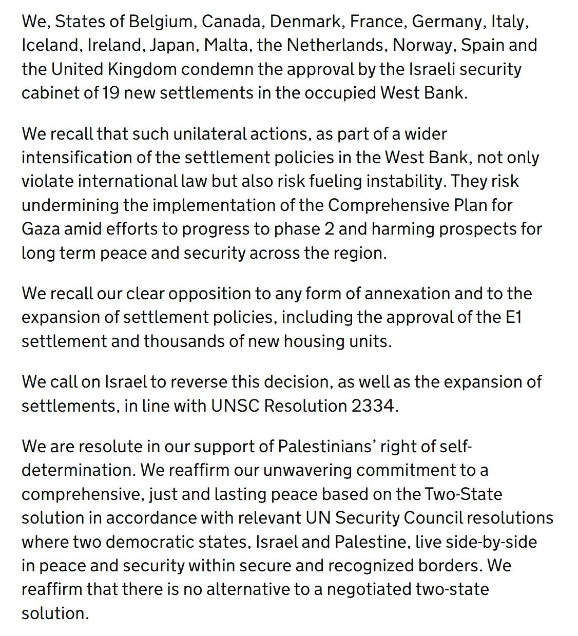 包括加拿大在内的14个国家发表联合声明,谴责以色列在约旦河西岸增加定居点 以色列财政部长贝扎莱尔·斯莫特里奇声称,周日以色列内阁宣布批准了在约旦河西岸增加19个新定居点,使过去几年新增定居点数量达到69个,以色列一直在推动约旦河西岸的扩张议程。 根据国际法,定居点被广泛认为是非法的,贝扎莱尔·斯莫特里奇的办公室表示,内阁于12月11日批准了该项目。 周三,加拿大与其他13个国家发表联合声明,谴责以色列安全内阁批准在被占领的约旦河西岸建设19个新定居点。其余国家分别是比利时、、丹麦、法国、德国、意大利、冰岛、爱尔兰、日本、马耳他、荷兰、挪威、西班牙和英国。 联合声明称:“我们记得,此类单边行动作为约旦河西岸定居点政策更广泛加剧的一部分,不仅违反国际法,还可能加剧不稳定。” 加拿大外交部长安妮塔·阿南德在X平台上发布帖子谴责了这一消息:“持续的定居点扩张违反了国际法,并危及了20点和平计划。显然,这种行为破坏了两国方案的前景,也破坏了以色列人和巴勒斯坦人和平共处的最终目标。“