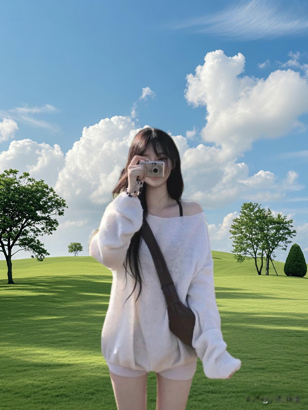 在蓝天白云下,少女与自然融为一体,享受宁静的美好时光。