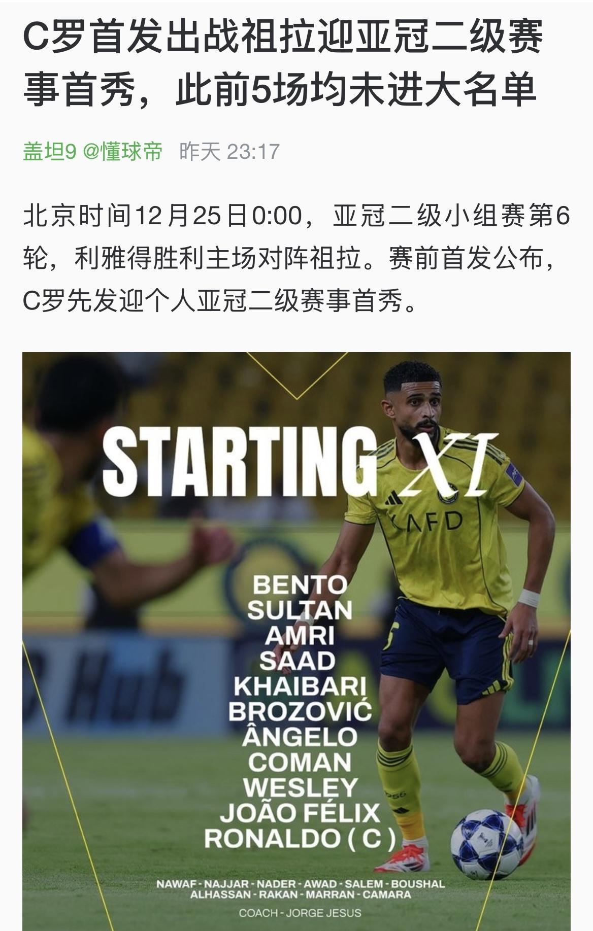 C罗有多鸡贼?一直不参加亚冠二级赛,利雅得胜利在小组赛里顺风顺水,五战全胜,提前以头名身份出线。C罗这才在第六轮登场参赛,有了一个助攻,这便可以营销天神下凡一己之力了。