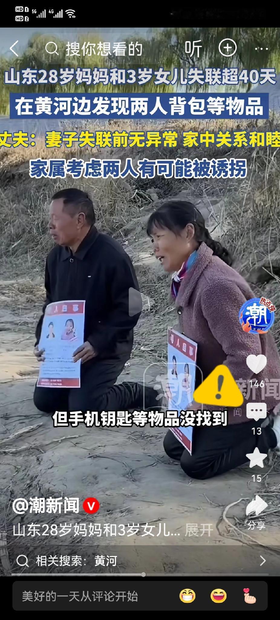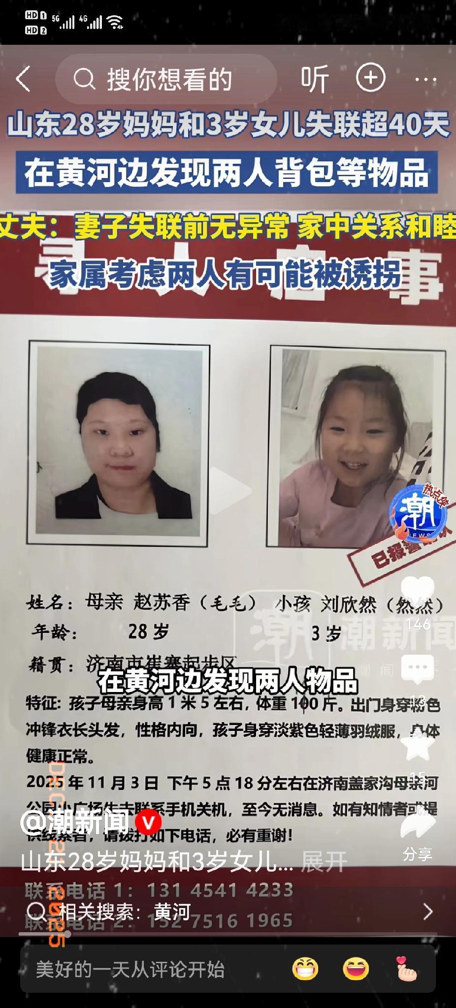 紧急求救,全网寻人:山东28岁妈妈和3岁女儿失联超40天,黄河边发现两人物品,真