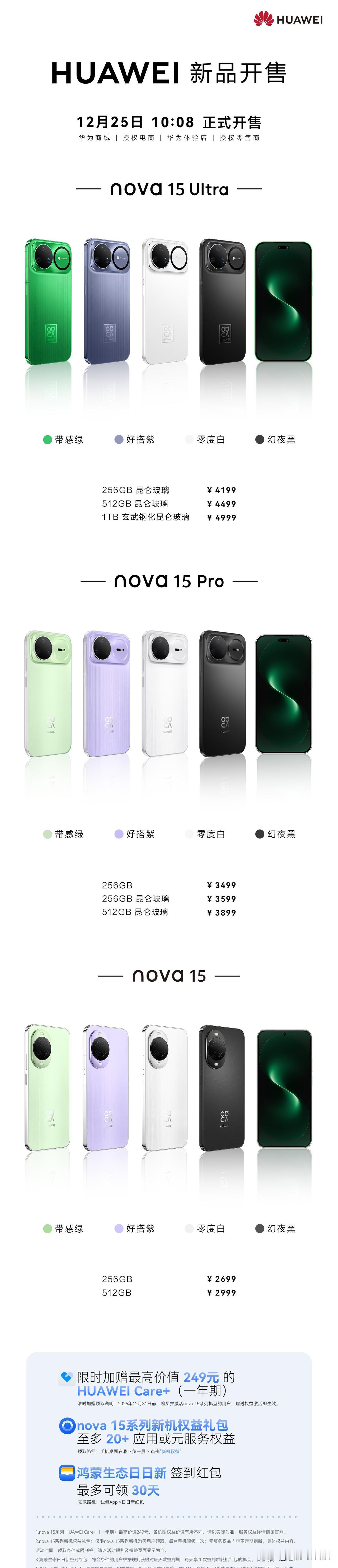 nova15系列今天10:08正式开售,这性价比真的在同档位没对手! nova15起售价2699元,却给了金属中框、耀目双星设计这种质感配置,还有前后双红枫镜头、100W超级快充Turbo,现在中端机涨价潮里,nova居然加量不加价,这波操作太圈粉了。 不仅颜值能打,实用性也拉满:双卫星通信和首发无网通信,应急的时候真的靠谱;鸿蒙系统的小艺帮帮忙,签到领积分、领券这些琐事一句话就能搞定,省了好多麻烦。Ultra 版还新增了50W无线充,补电更方便,搭配麒麟9010S芯片,日常多任务切换丝滑到不行。 不管是学生党还是上班族,想换一款颜值、配置、价格都在线的手机,还能叠加鸿蒙日日新红包以及800元新机权益礼包和249元care+,直接冲 nova15 系列就对了,超级nova超级香,早买早享受。