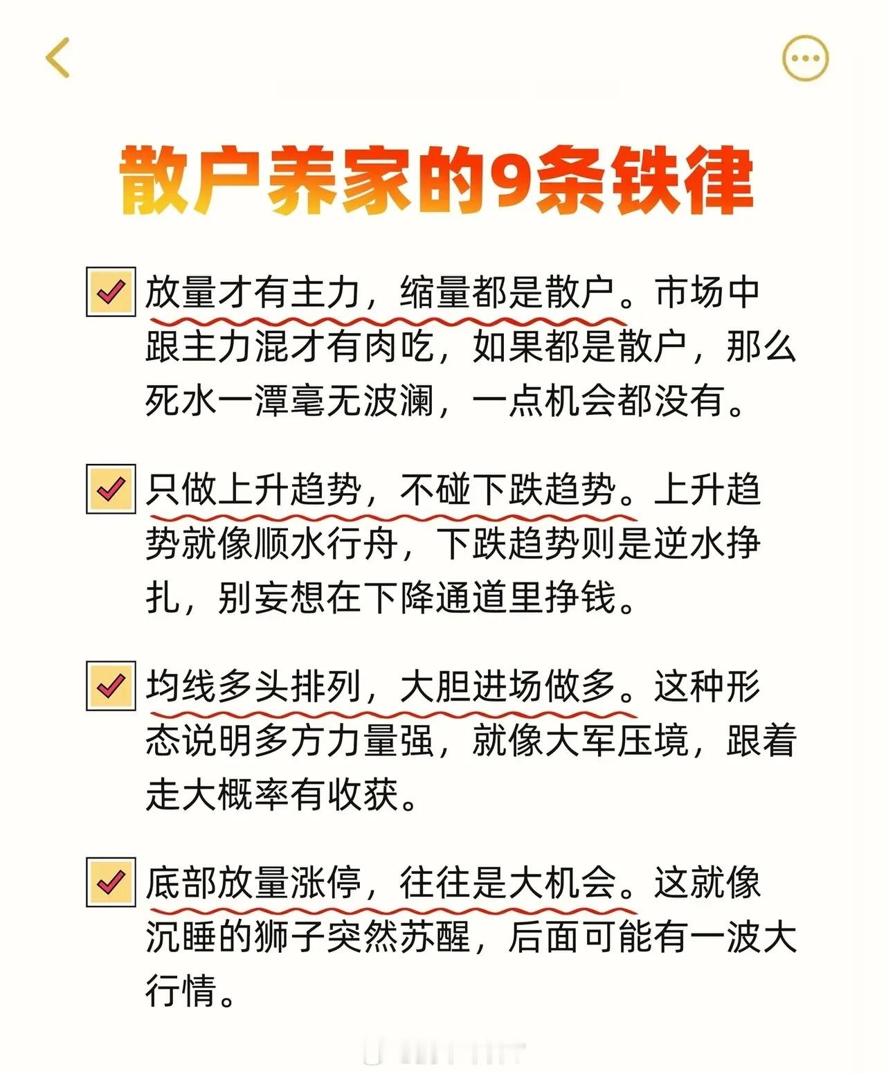 股票投资实用的操作法则:“散户养家的9条铁律”:一是放量才有主力,缩量多是散户博弈,需跟随主力寻找机会;二是只做上升趋势,避开下跌趋势,顺势而为更易盈利;三是均线呈现多头排列时可大胆做多,此时多方力量占优;四是底部出现放量涨停往往是重大机会,后续可能开启一波行情。五条具体投资建议:高位放量滞涨时需赶紧离场观望,警惕风险如同气球将破;尾盘突然拉升并非好事,可能是主力为次日出货铺垫,不要轻易追入;早盘急速下跌不必恐慌,若趋势未破可能是主力洗盘,后续或有反弹;题材是投资的重要支撑,有热门题材的股票更易上涨;需严格控制仓位,避免集中持仓留好后路;同时要坚决执行止损止盈,不存侥幸心理,利好兑现甚至要提前离场。整体内容从趋势判断、主力识别、形态分析到具体操作细节,为投资者提供了清晰的股市参考方向。