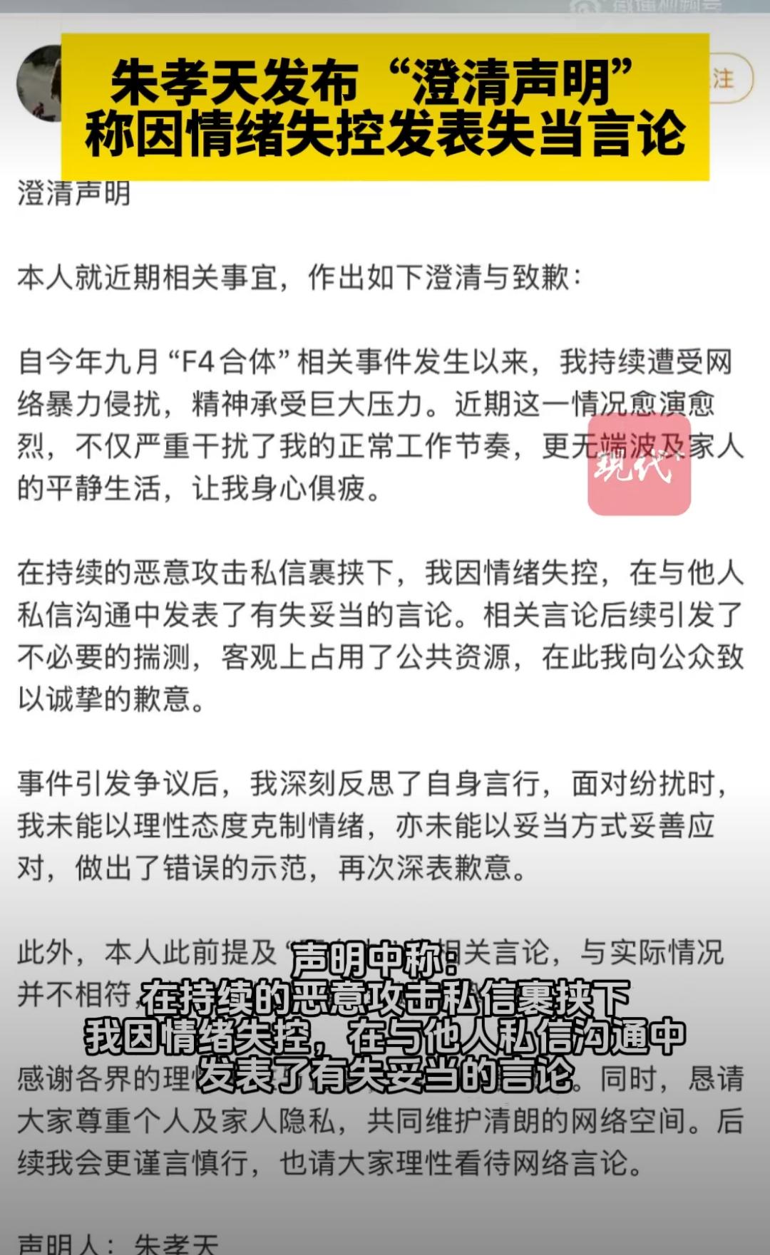 12月25日晚,朱孝天发声明回应“F4合体”相关争议:最近被一堆恶意私信围攻,他情绪一上头,在私信里说了些不太妥当的话,结果被传开后引发各种脑补,还占用了公共资源,所以郑重道歉。讲真,明星也是人,被私信轮番轰炸谁都容易破防,但“情绪失控”不是免死金牌。希望这次大家都冷静点,别把一场口水战演成连续剧。