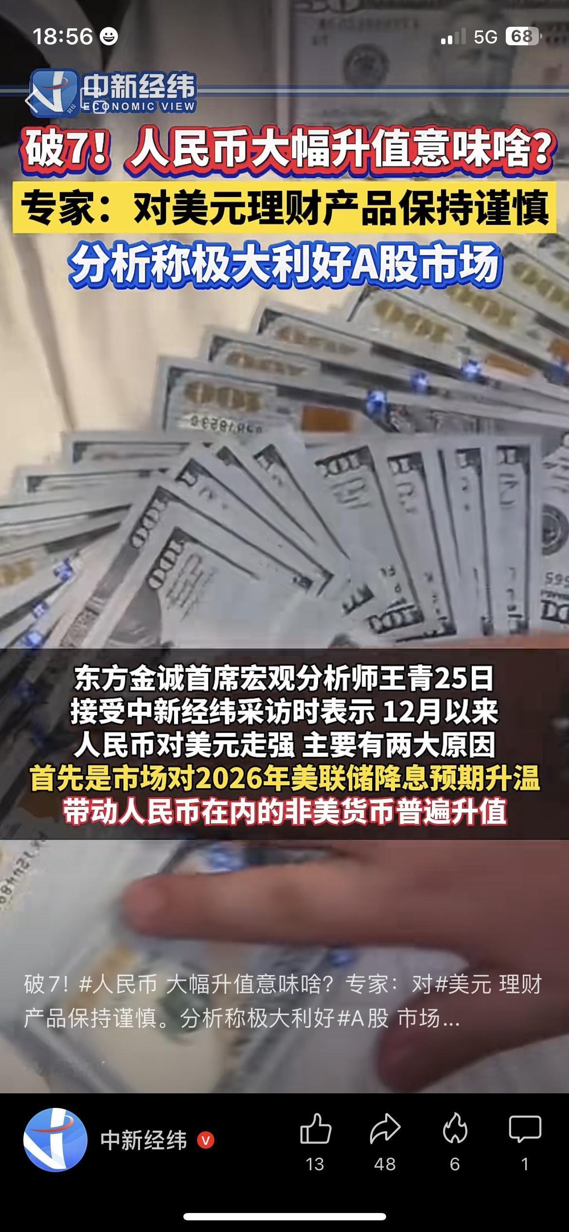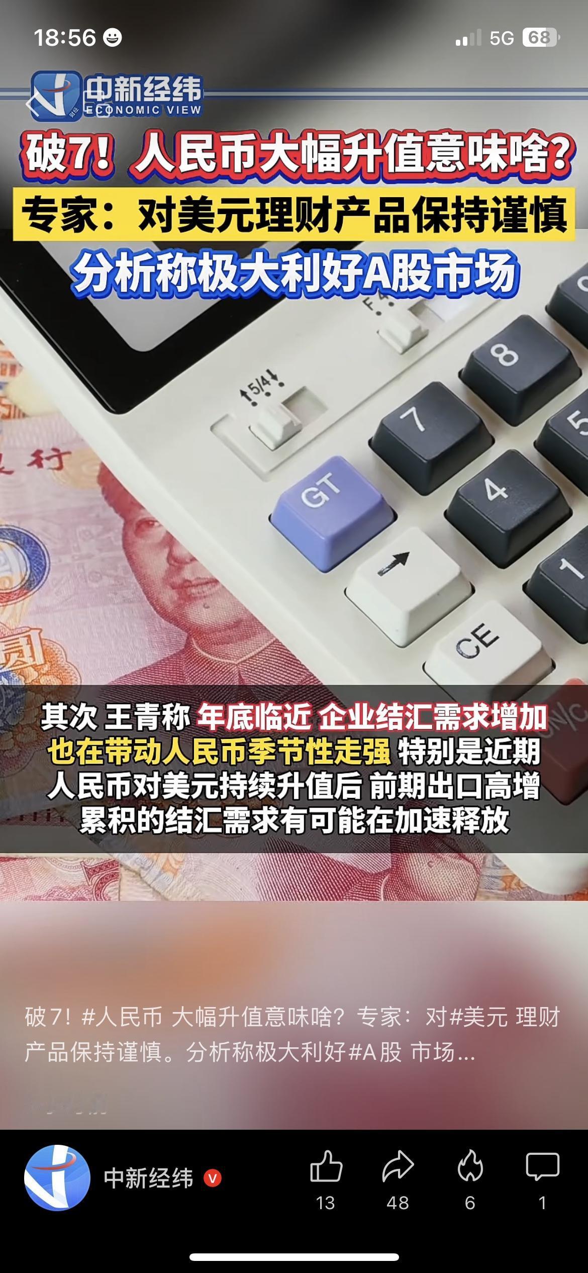 换汇的赚麻了!人民币破7大幅升值,留学海淘成本直降 外汇理财攻略 去银行换美元的张姐 盯着汇率屏,当场停下了办理手续 人民币对美元汇率直接破7走强 留学换汇、海淘成本立省一大笔 做跨境电商的商家守着汇率走势图 指尖算着进出口利润,嘴角慢慢上扬 专家提醒美元理财要谨慎布局 人民币升值还被看好利好A股外贸板块 不少人都开始调整手里的外汇资产 汇率波动的红利,终于落到普通人身上 你近期有留学换汇或海淘的计划吗? 人民币升值,你觉得哪些行业能最先吃到红利?人民币汇率