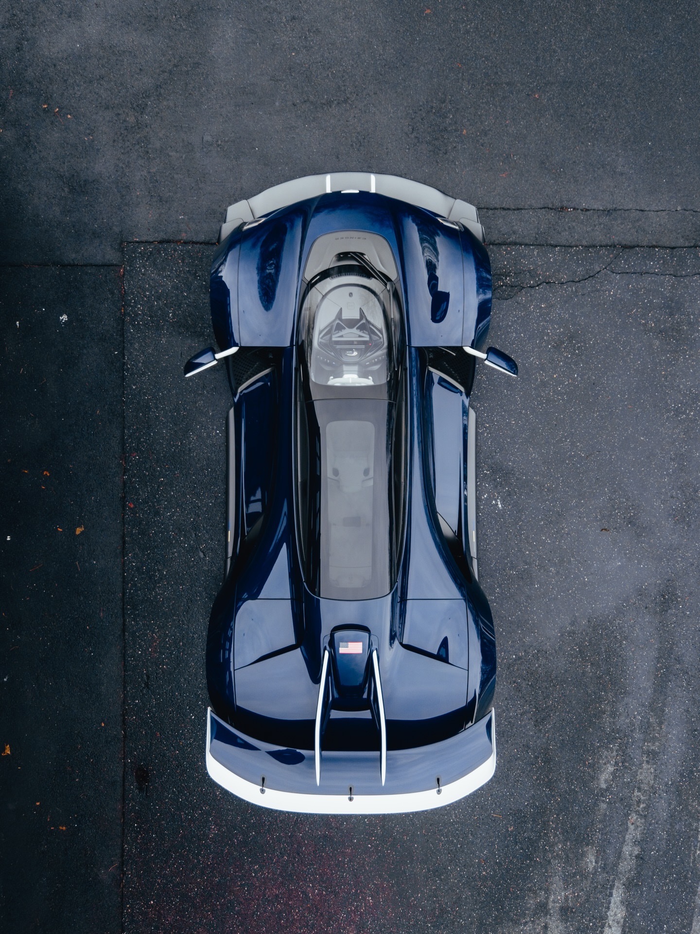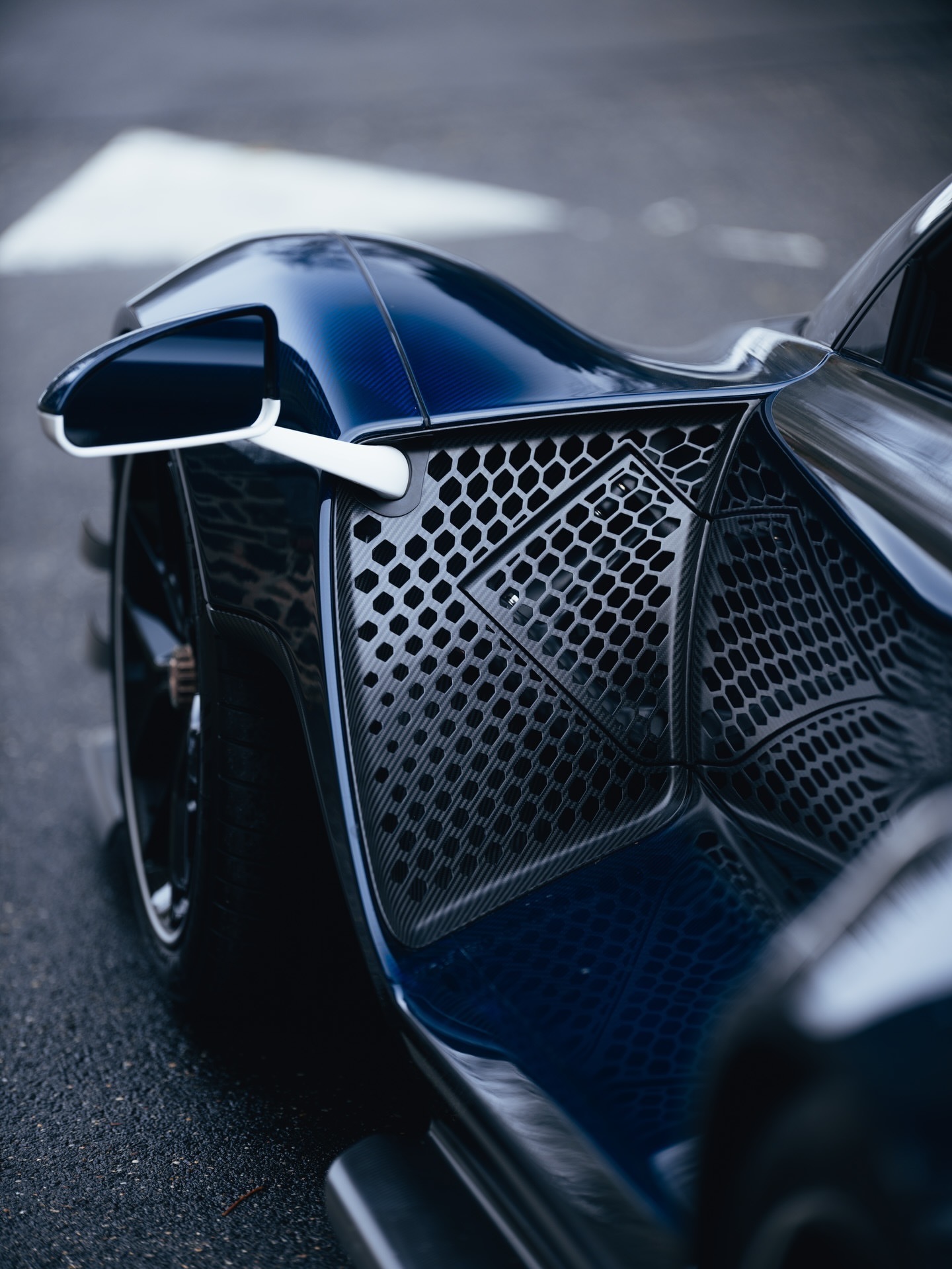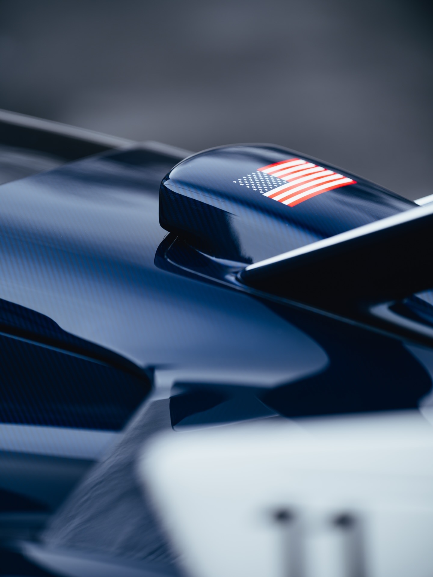 这款21C是21世纪最独特的车型之一。这款21C的高下压力变体展示了裸露的蓝色调碳纤维和白色装饰,以及一个引人注目的美国国旗细节,采用了负空间设计,蓝色碳纤维本身形成了国旗的蓝色背景,只有红色、白色条纹和星星被涂画在上。在整个车身其余部分,白色被巧妙地涂在空气动力学特征的底部和背面,模仿喷气式发动机尾焰,并增强了21C所知名的战斗机主题。Czinger老纪侃车豪车超跑