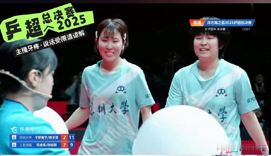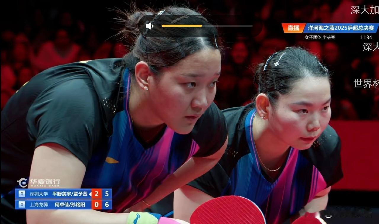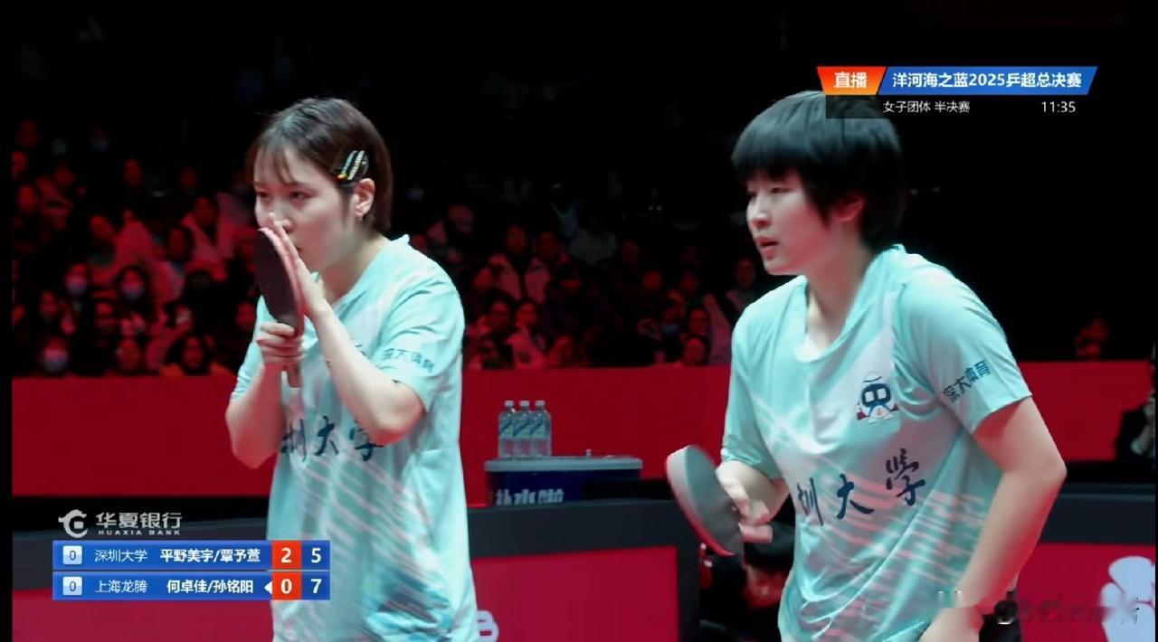 平野和小蘑菇都笑的很甜啊。 没想到今天深大的阵容是让覃予萱和平野美宇两个人打女双了,蒯曼打一单,上海龙腾也变阵了。刚刚看了比赛,平野美宇/覃予萱是3-2赢了何卓佳/孙铭阳,为深大拿到第一分,不过佳佳和阳阳打的也很好了,连追了2局,她们也是打到了决胜局。莎莎没来打比赛,深大就把平野和蒯曼拆了女双,让平野和覃予萱打女双了。 赢下第一盘比赛后,看到覃予萱和平野都笑了,平野美宇穿这个颜色的衣服也很漂亮啊。第二盘比赛是蒯曼对阵刘炜珊,也是熟悉的队友,第三盘是覃予萱对阵孙铭阳。看样子深大晋级决赛应该没多大问题,不过比赛还有进行中,不到最后一刻还分不出胜负来。 莎莎是因为脚伤不能参加乒超总决赛,昨天她也在远方给深大幼儿园的小朋友们加油啦,没有莎莎在,三个小朋友要多拼一拼啊,继续加油!