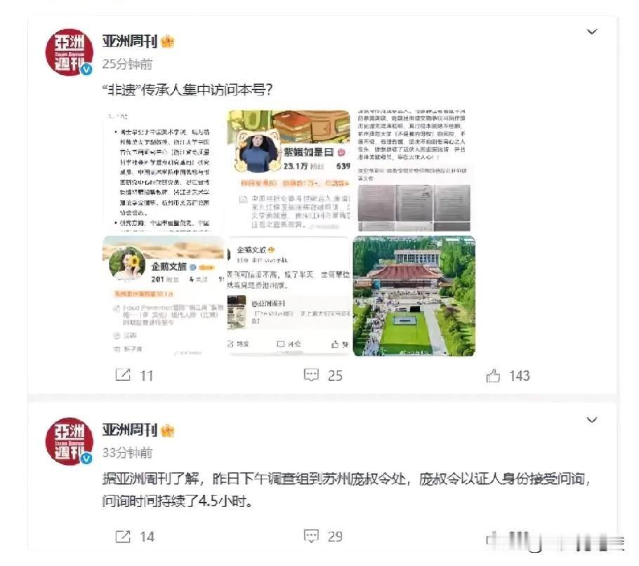 《亚洲周刊》大早晨就放出两个关于庞家和南京博物院的消息。 庞叔令已经在苏州接受调查组的问询,并且是以证人的身份 部分“非遗”传承人在微博上说,《亚洲周刊》这家媒体可信度不高,说《亚洲周刊》没有主管单位。 网友说:主管单位不一定能保证内容的真实性,并且呼吁《亚洲周刊》公开4个半小时问询的内容,不公开这个内容,谁都不知道真实情况是什么!这能引起共鸣! 现在庞家信任的媒体就只有《亚洲周刊》了,庞家所有的声明和回复都通过这家媒体发布。由此可见,《亚洲周刊》在庞家眼里的地位。 这次问询庞家的内容,很多人都在猜测内容,包括庞家捐赠给南京博物院的文物、证明文件、与南京博物院的纠纷、南京博物院拿庞家这些文物做展览……等, 内容都在讨论之中。无论讨论内容如何,大家都盼着坏人被惩罚!