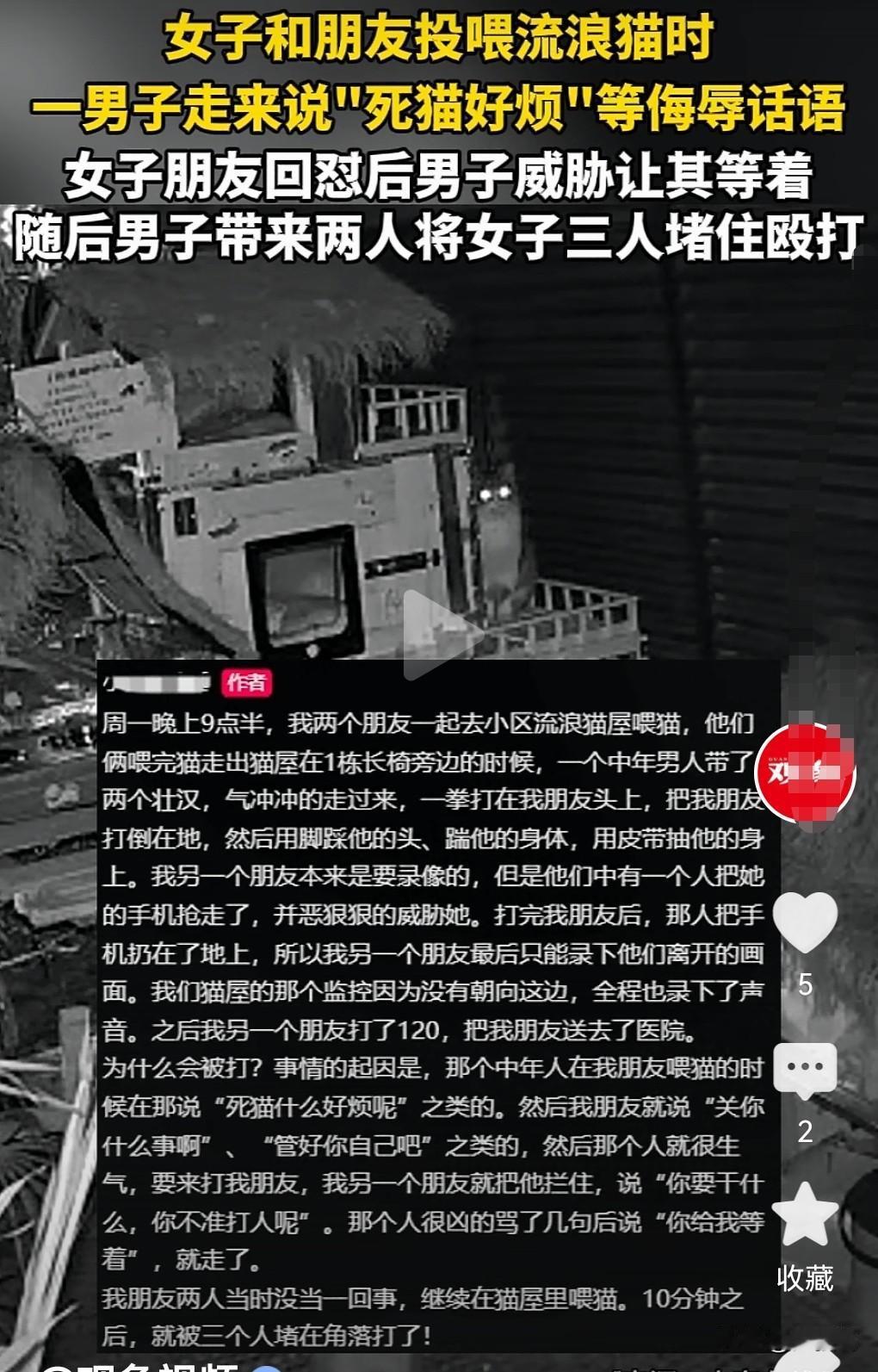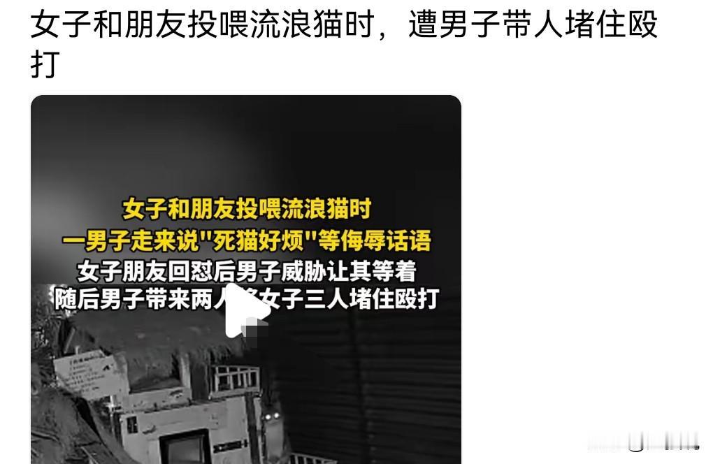 这也太无法无天了吧,还有王法吗?还有天理吗? 女子和朋友投喂流浪猫,这本是一件很有乐趣的事情。 突然过来一个男的说:死猫好烦。 女子的朋友回怼了。 那男的说你们等着。 原来那男的去叫了人过来了,对他们进行了殴打。 这真是太无法无天了,一定要把这打人者抓住拘留啊,不能够让他们逍遥法外。 这样的暴力行为是对法治社会的严重挑衅。