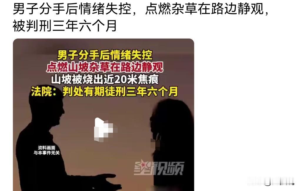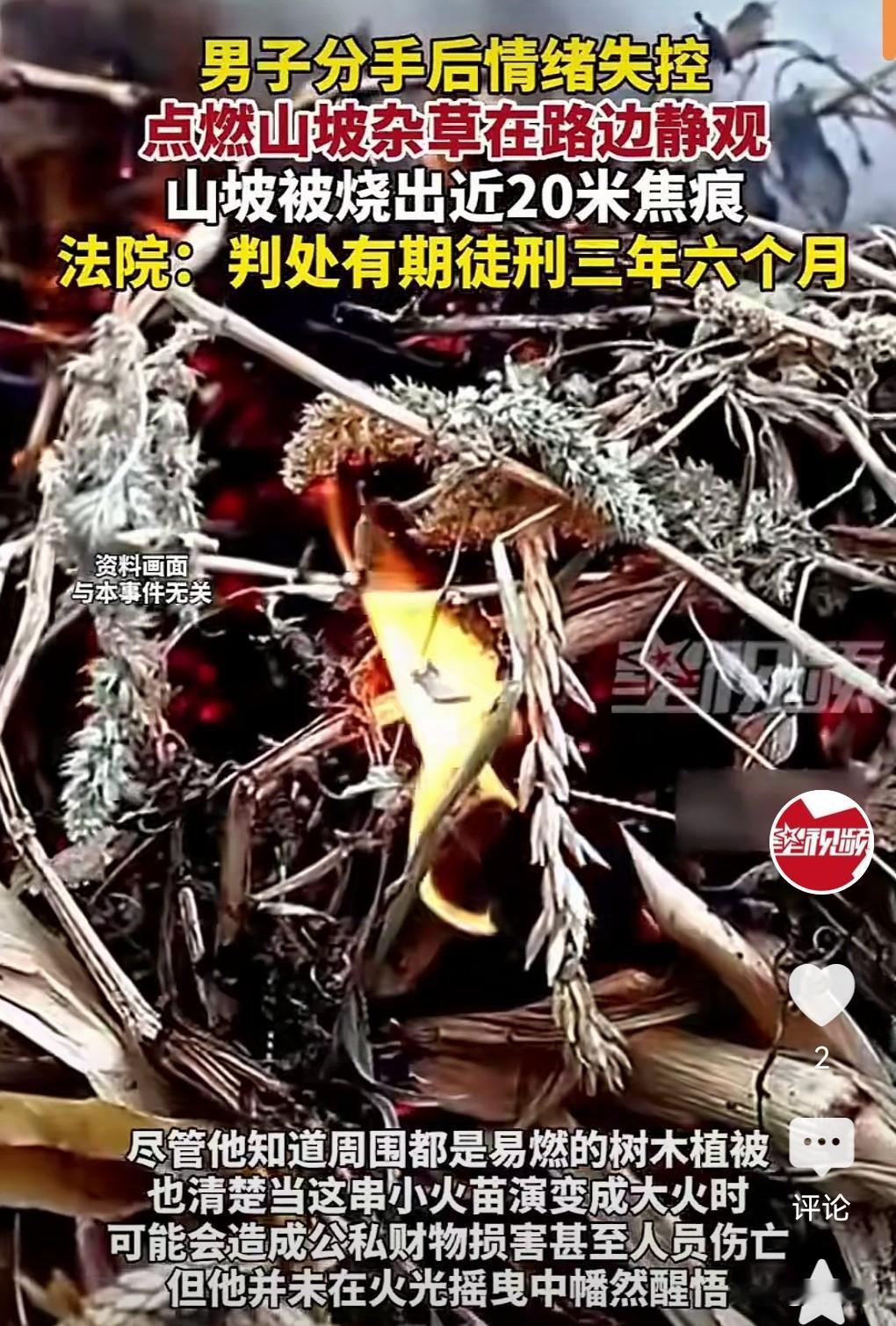 这真是敲响了警钟啊,千万不要放火啊。 后果是非常严重的。 2025年3日,一男子由于和女友吵架分手。 心情非常的不佳,于是在郁闷中点燃了一颗杂草。 结果引发了火灾。 山坡被烧出20米焦痕。 男子最终被判有期徒刑三年6个月。 所以说放火这个罪是非常严重的。 千万不要手欠。