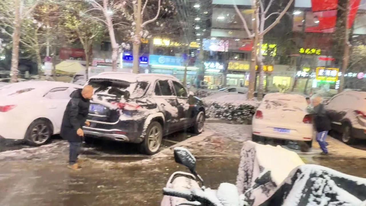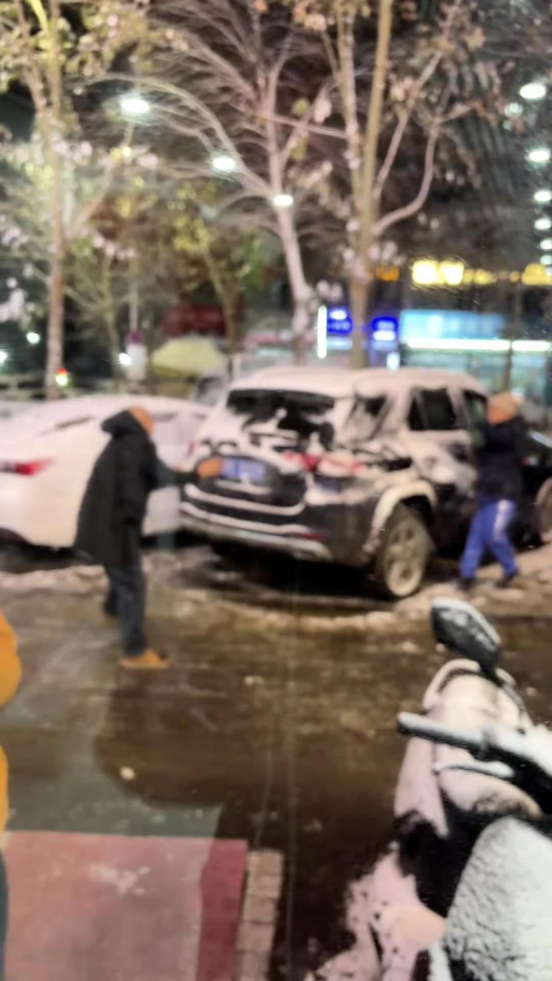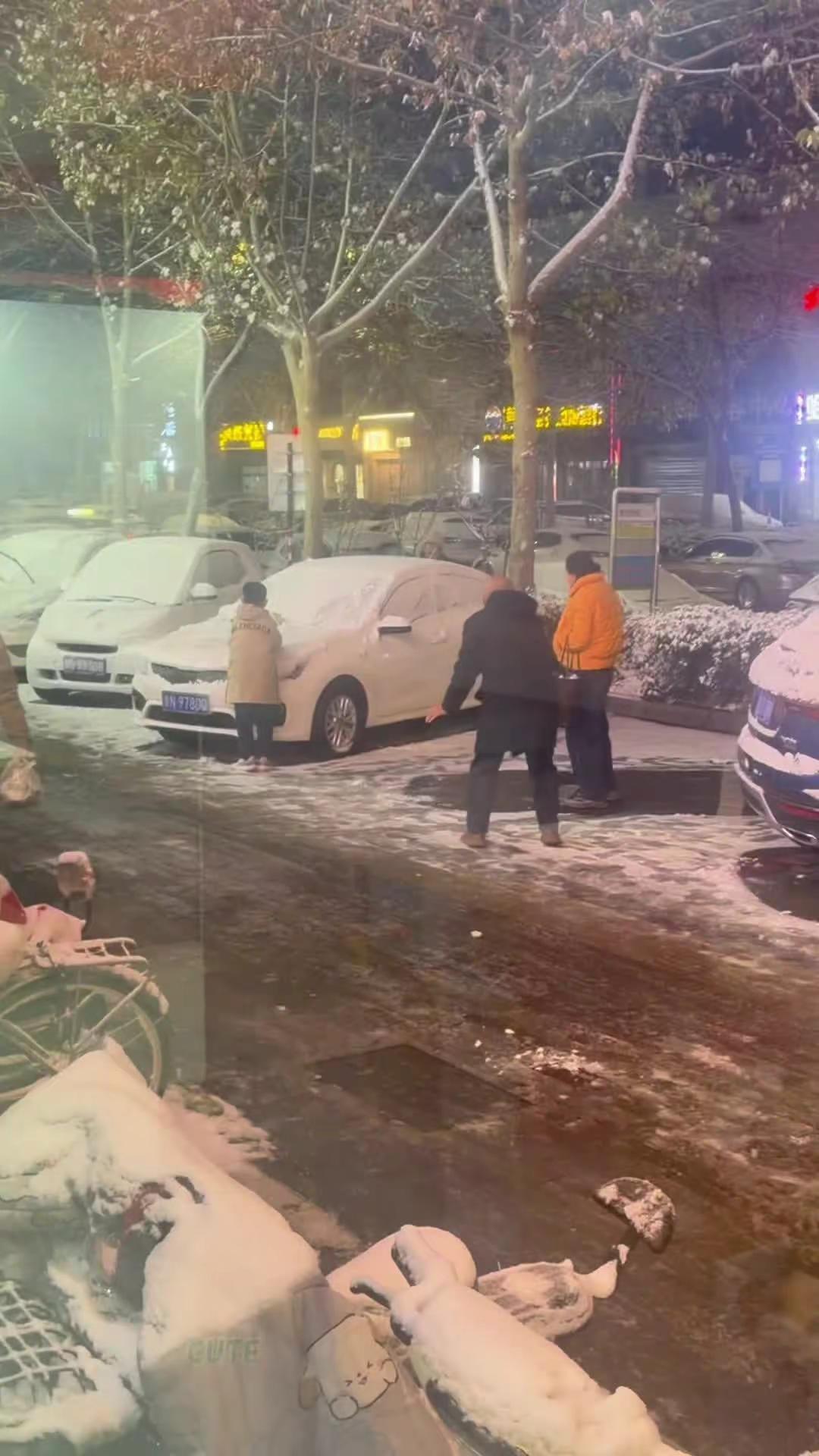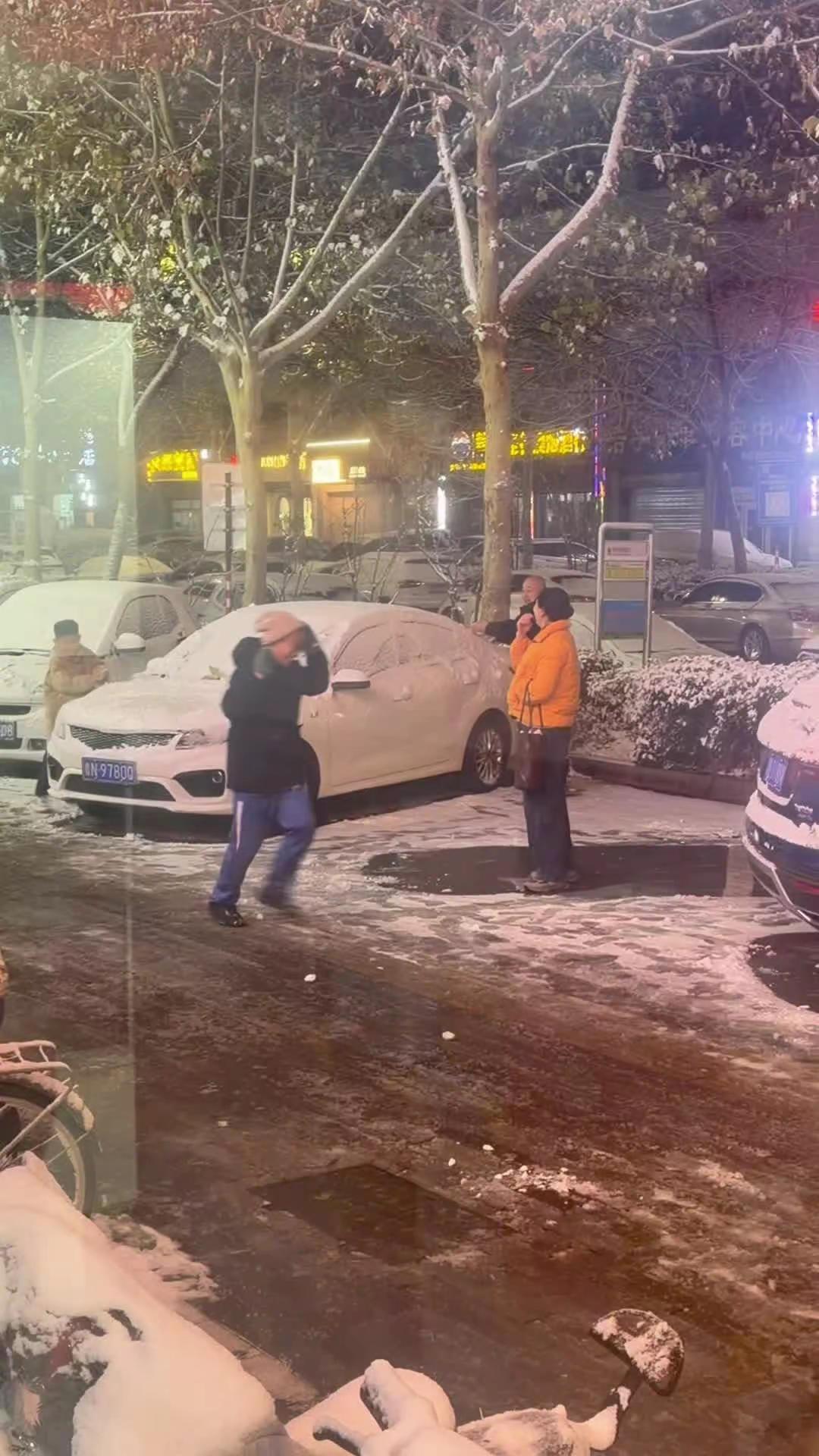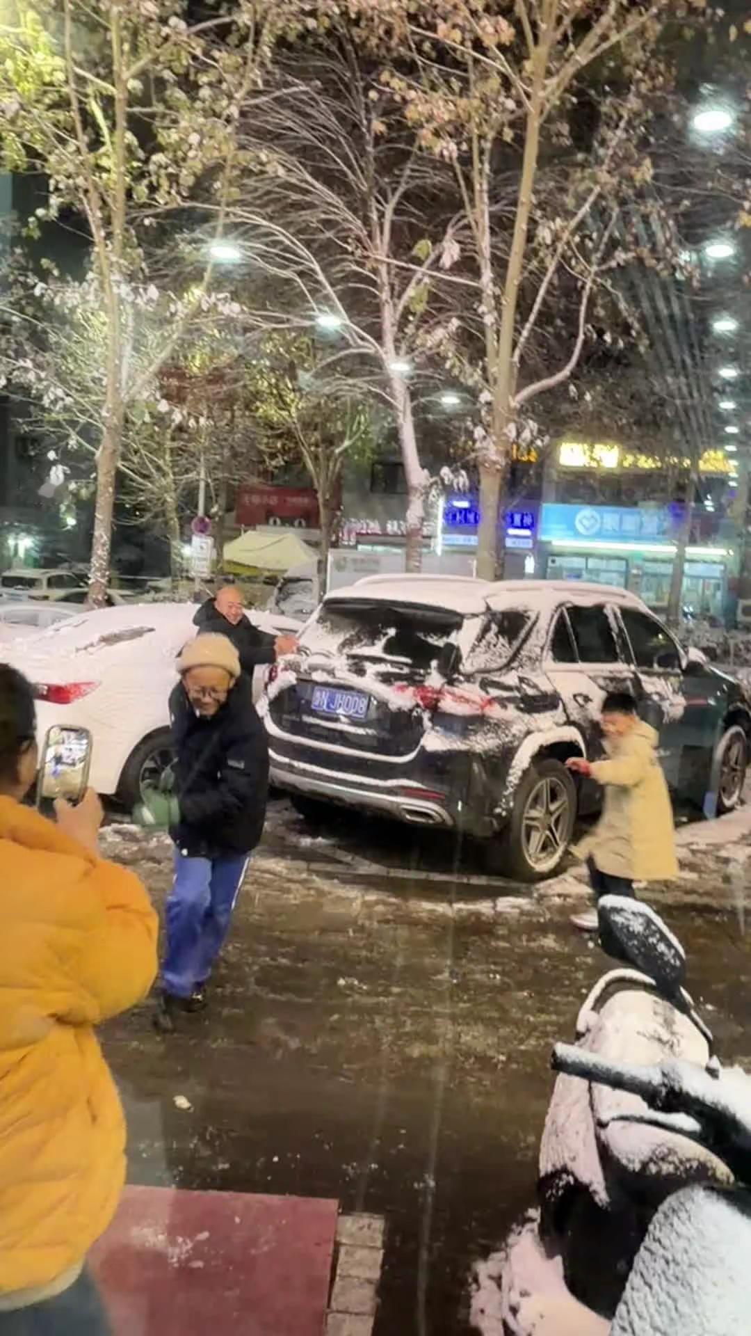 俺妈看俺老爸和他的外孙打闹在屋里的俺看着外面的他们俺爹也是个老小孩儿下雪了