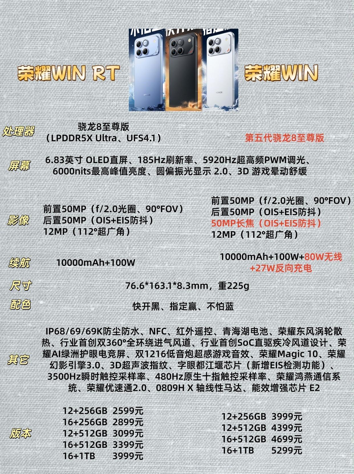 荣耀WIN系列最强电竞手机发布,分为荣耀WIN RT和荣耀WIN两款机型,10000mAh青海湖电池、25000转/分钟涡轮风扇散热和行业首创AI超帧+AI超分双功能并发是最大的亮点,代言人是超美的张予曦。 两款机型的区别在哪里? 1、荣耀WIN RT是骁龙8至尊版处理器,而荣耀WIN是第五代骁龙8至尊版,性能更胜一筹; 2、荣耀WIN是三摄,多一个5000万像素的长焦; 3、荣耀WIN支持80W无线充和27W反向充电; 预算一般的冲荣耀WIN RT完全够用了。