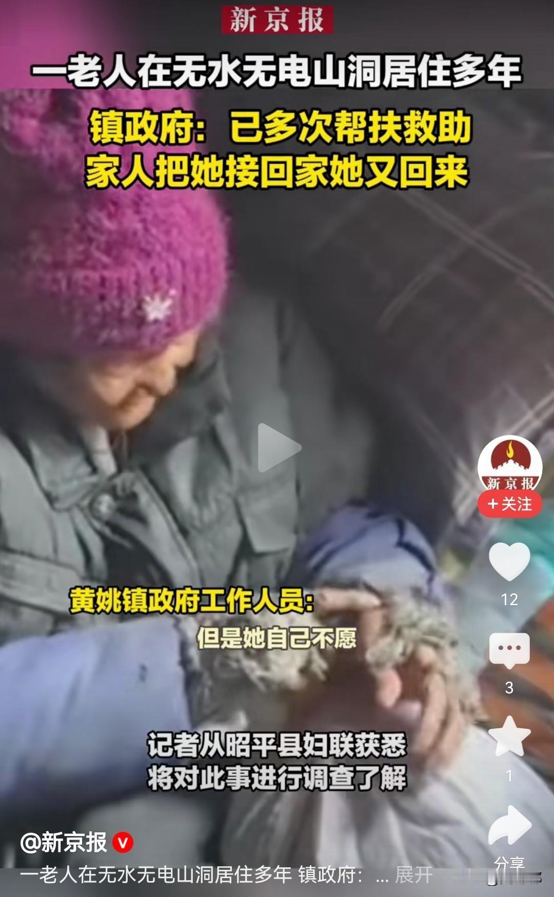 每次看到这种事就特别揪心! 图片中的这位老奶奶 独自住在山洞中好几年,山洞中没水没电,吃全靠当地镇政府 和好心人 送的食物! 她有家 有子女,她就是不愿意回去 ,接回去过几次又跑出来! 我是非常理解 这样的老人的,她觉得自己老了,不想在拖累子女了,然后自己就跑出来住到山洞了! 因为我这里就有这样一个例子,一位60多岁的老人被查出癌症,她也不治 直接回家了!过一段时间她悄悄的跑到隔壁村的一个溶洞里跳水自杀了 她宁愿牺牲她自己也不会去拖累自己的子女!