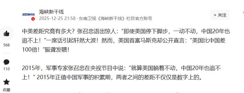 中美差距究竟有多大?张召忠语出惊人:“即使美国停下脚步,一动不动,中国20年也追不上!”一席话引起轩然大波!然而,美国首富马斯克却公开直言:“美国比中国差100倍!”振聋发聩!     先说说张召忠的这句判断,很多人不知道,这话是他2015年4月在央视《防务新观察》节目里说的,当时聚焦的是中美军力对比,可不是泛泛而谈的整体差距。   张召忠是谁?他是海军少将出身,还是国防大学的教授,一辈子研究军事战略,说话都靠数据支撑。   那会儿的背景是,美国军费高达5960亿美元,咱们只有1450亿美元,差了四倍还多。   美国有10艘核动力航母,全球部署的军事基地上千个,F-22、F-35这类五代机已经有数百架,飞行员训练体系成熟。   而咱们呢,辽宁舰刚完成海试没多久,舰载机起降还在磨合,歼-20才首飞几年,原型机没几架,发动机还得靠进口。   张召忠当时强调,军力差距不只是装备数量,更在质量和体系。   美国经过冷战多年积累,军工体系、实战协调能力都相当成熟,而咱们的联合作战演习规模刚过万人,远洋补给能力也差得远。   说白了,他这话不是唱衰,而是提醒大家别盲目乐观,得清醒认识差距。   这话一出,网上吵翻了天,有人觉得逆耳难听,也有人认可这是实在话,新华社后来还发评论员文章呼应,说“清醒认识差距,方能砥砺前行”。   再看马斯克的“美国比中国差100倍”,这话也不是随便说的,他是在一次记者会上被问起中美差距时说的,核心聚焦的是基础设施建设效率。   马斯克作为特斯拉和SpaceX的创始人,常年打交道的就是工程建设和技术落地,对效率的感受最直观。   他举了两个例子,一个是中国1500名工人用9小时就完成了一座火车站的改造,另一个是北京三元大桥修复只用了43小时。   这两种在国外需要数周甚至数月的工程,咱们几天就搞定,让他特别震撼。   反观美国,马斯克满是无奈,纽约的拉瓜迪亚机场改造2016年就启动,直到2021年还没完工;加州高铁项目2008年就规划,至今还在拖延,成本一涨再涨。   他觉得美国基建效率低,根源在繁琐的审批流程、官僚主义内耗,还有高昂的劳动力成本,这些问题让美国在基建领域远远落后于中国。   所以他说的“差100倍”,精准指向的是基建效率,可不是说美国整体实力不如中国。   这么看就清楚了,两人的观点根本不矛盾,只是讨论的领域和时间点不同。   这十年过去,张召忠当年说的差距已经大幅缩小,现在咱们的歼-20产量超200架,发动机实现国产化,福建舰带着电磁弹射技术下水,055型万吨驱逐舰批量服役,海军吨位翻了好几倍。   而美国这边,福特级航母电磁弹射问题不断,F-35故障频发,造船能力远远跟不上咱们。   客观说,中美差距现在是结构性的,经济上,按购买力平价算咱们早就超过美国,制造业规模是美国两倍多,但美元霸权、金融体系还有差距。   科技上,咱们在新能源、AI应用、生物技术等领域已经跟美国并跑甚至领跑,但高端芯片、EDA软件这些基础领域还得补课。   基建上咱们效率领先,但美国的全球军事部署、海外盟友网络仍是优势。   权威机构也判断,未来十年中美会形成“双强并立”的格局,差距会持续缩小,但不会一下子消失。   其实不管是张召忠的提醒,还是马斯克的感慨,都反映出中美差距的复杂性,不能简单用“谁强谁弱”来概括。   咱们既要看到这些年的快速进步,也得承认还有需要追赶的地方。   以上都是个人观点,对此您有什么不同的看法,可以在评论区留言讨论!!!