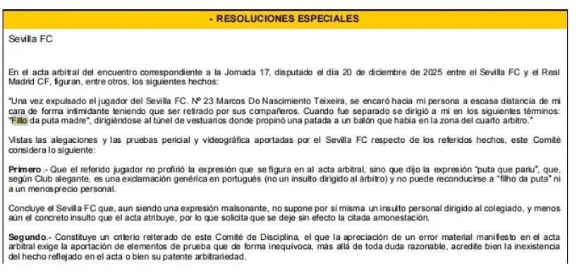 裁判报告中写道:“在塞维利亚足球俱乐部一名球员被罚下后,即23号马科斯-特谢拉,该球员以带有威胁性的方式在极近距离直面我本人,不得不被其队友拉开。当被分开后,他用以下言语对我说:‘Fillodaputamadre’(**养的),随后走向球员通道,并对位于第四官员区域的一只足球踢了一脚。”