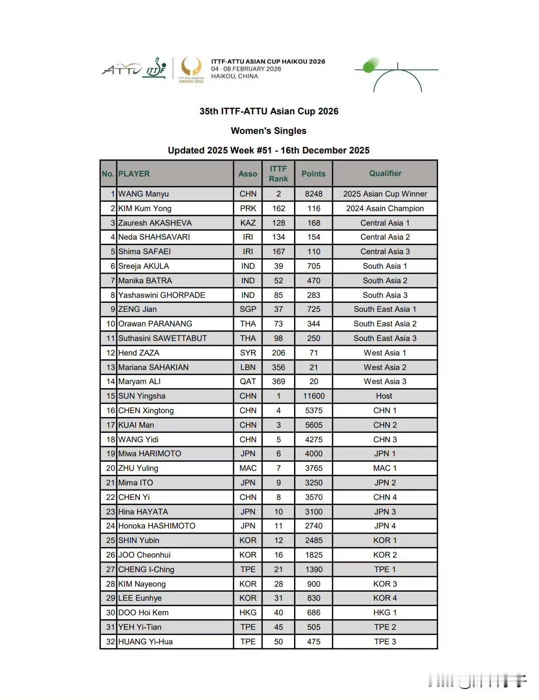 第35届国际乒联-亚乒联盟亚洲杯丨邀请名单出炉,加了一句:最终参赛以实际报名为准。 好幽默的是孙颖莎和林诗栋居然是主办方邀请使用的是外卡。 2024亚锦赛冠军还能直接入围2026亚洲杯吗? 那么2024年奥运会单打和团体冠军不能直接入围2026亚洲杯吗? 2025全运会单打冠军不能直接入围2026亚洲杯吗? 是亚锦赛冠军的含金量比奥运会和全运会的含金量高吗? 还是只因为他是樊振东所以不能打亚洲杯? 樊振东 亚洲杯 林诗栋