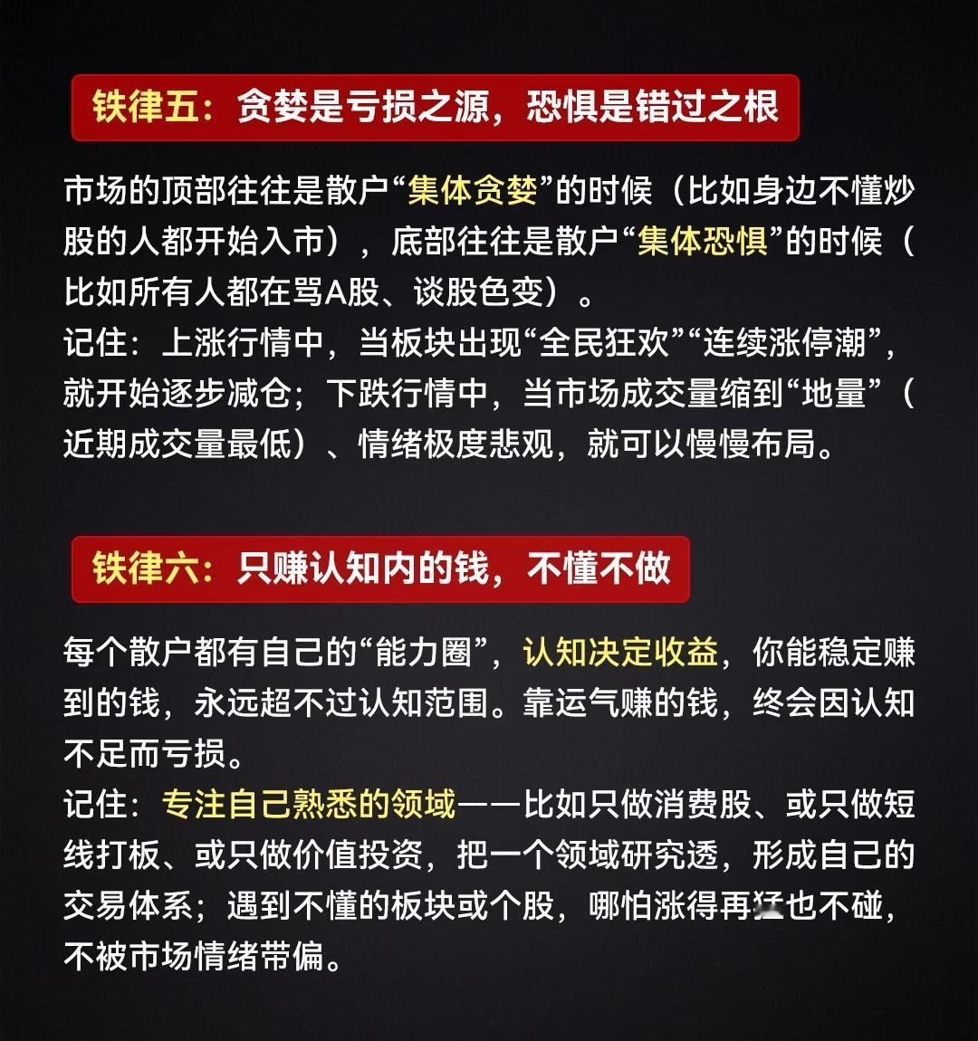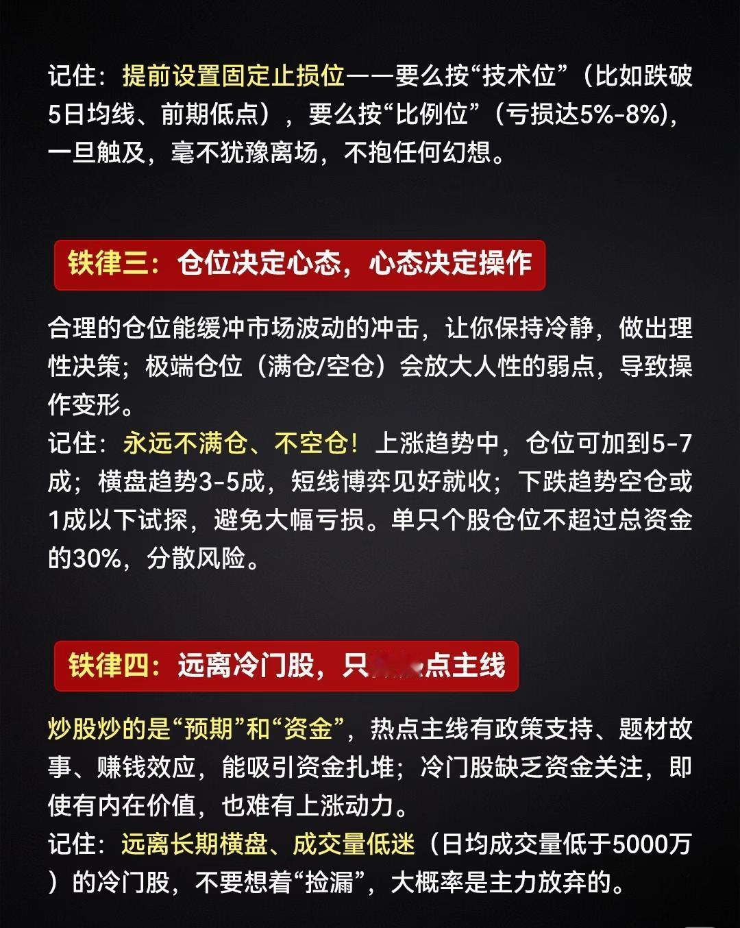 20年不变的A股6大铁律总结如下: 铁律一:顺势而为,不可逆势硬扛。市场趋势力量远超个人判断,上涨趋势看均线多头排列(5日、10日、20日均线依次向上),只做多不做空;下跌趋势看均线空头排列(均线依次向下),只观望不抄底;横盘趋势以震荡为主,轻仓短线博弈即可。 铁律二:止损不止盈,保住本金是底线。本金是炒股根本,一次30%的亏损需后续上涨43%才能回本,50%的亏损需100%上涨弥补。需提前设置固定止损位——要么按技术位(如跌破5日均线、前期低点),要么按比例位(亏损达5%),一旦触及毫不犹豫离场,不抱幻想。 铁律三:仓位决定心态,心态决定操作。合理仓位能缓冲市场波动,保持理性;极端仓位(满仓/空仓)会放大人性弱点致操作变形。永远不满仓、不空仓,上涨趋势仓位5-7成,横盘3-5成,下跌空仓或1成以下试探;单只个股仓位不超总资金30%,分散风险。 铁律四:远离冷门股,只做热点主线。热点主线有政策支持、资金扎堆与赚钱效应,冷门股缺乏资金关注难有上涨动力。远离长期横盘、成交量低迷(日均低于5000万)的冷门股,勿盲目“捡漏”。 铁律五:贪婪是亏损之源,恐惧是错过之根。市场顶部常是散户集体贪婪时(如不懂炒股的人都入市),底部是集体恐惧时(如众人骂A股、谈股色变)。上涨行情中板块全民狂欢、连续涨停潮时逐步减仓;下跌行情中成交量缩至地量、情绪极度悲观时慢慢布局。 铁律六:只赚认知内的钱,不懂不做。认知决定收益,稳定赚的钱不超认知范围,靠运气赚的钱终因认知不足亏损。专注熟悉领域(如消费股、短线打板或价值投资),研究透形成自身交易体系;不懂的板块或个股,哪怕涨得猛也不碰,不被市场情绪带偏。