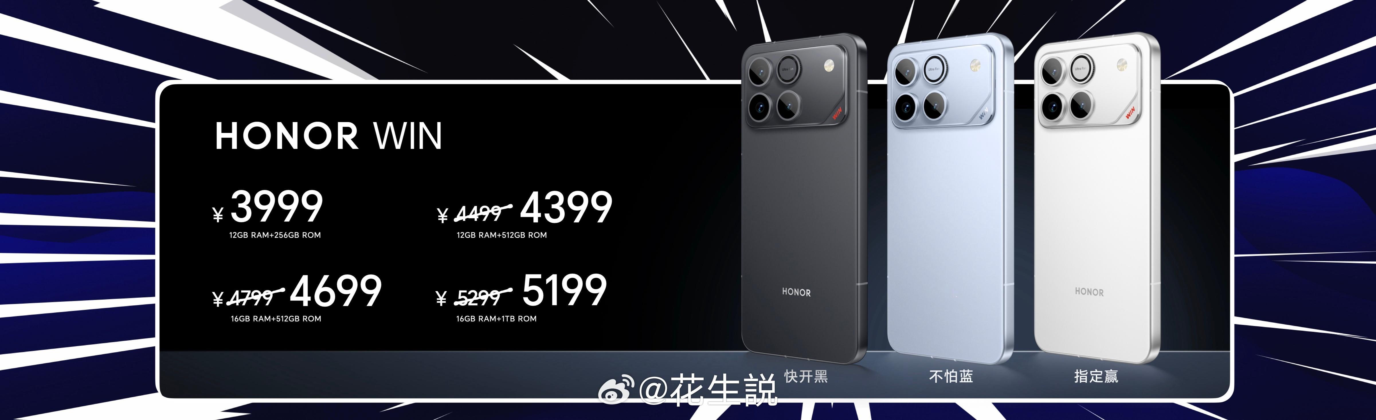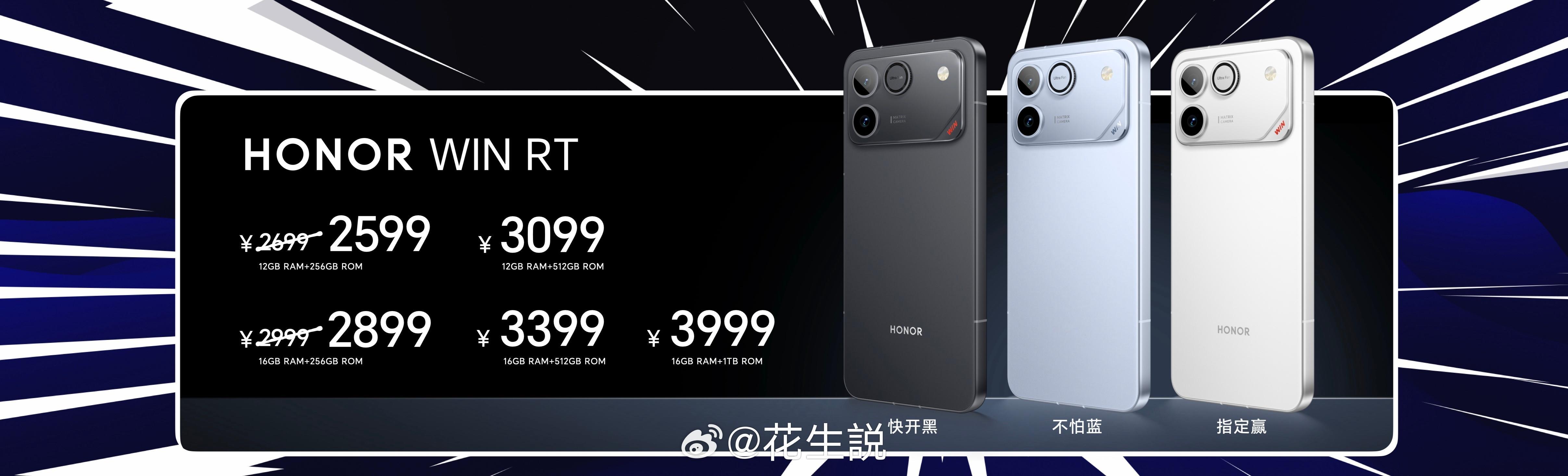荣耀WIN系列共带来快开黑、不怕蓝、指定赢3款配色,现已全面开售,首销期间,共有总价值超过3829元的权益。上电商平台搜“荣耀WIN” 赢升杯赢免单,性能夯到顶,礼品赢麻了!荣耀WIN RT 12GB+256GB、16GB+256GB、12GB+512GB、16GB+512GB、16GB+1TB版本售价分别为2699元、2999元、3099元、3399元和3999元;荣耀WIN 12GB+256GB、12GB+512GB和16GB+512GB、16GB+1TB版本售价分别为3999元、4499元、4799元和5299元。 荣耀WIN荣耀WIN价格年度夯机荣耀WIN价格真香