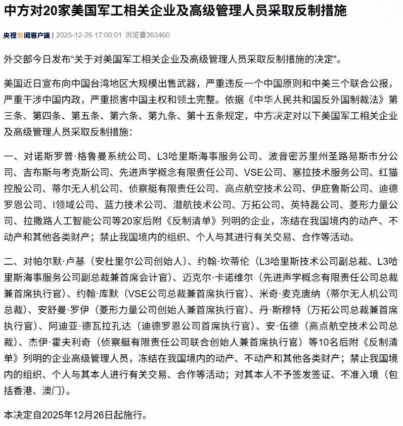 我们这次的反制能打疼老美吗? 先说结论,冻结在我国资产及切段其继续在我国捞金的可能,对某些公司和个人是切实的打击,即便有些在我国没啥资产和业务,也总归能恶心下它们! 因老美对台高达110亿美元的军售案,我国在今日作出强烈反制,一下制裁了20家美国军工相关企业及10名企业高级管理人员,冻结了它们在华所有财产,企业不能继续在我国有贸易合作,人员不能入境。相当于不光现在还在国内的财产被冻结了,也切段了它们未来在我国捞金的可能,更重要的是制裁展示了中国运用法律工具进行反制的决心和能力。 对于部分供应链依赖中国或看重中国市场前景的企业(特别是一些新兴科技公司),打击是切实的。虽像诺斯罗普·格鲁曼、波音(防务分支)等大型军火商,其主业和核心市场不在中国,对其直接的经济冲击可能有限,但制裁的威慑与污名化效应不容忽视。 尤其是制裁首次明确针对企业高管个人,冻结其个人在华资产并禁止入境。这增加了决策者的个人风险与成本,传递出“谁参与,谁负责”的强烈信号。 总之,此次制裁是兼具法律硬度与经济痛感的精准反击。虽然对部分全球军工巨头的短期财务冲击可能有限,但它通过增加决策者个人成本、剥夺在华未来市场机会、形成强大法律与政治威慑,构建了一个让违规者“疼”的立体网络,其长期和战略影响更为深远。 若它们还不知悔改,届时直击依法巡视台海,搞个打击违禁品运输也不是没可能。