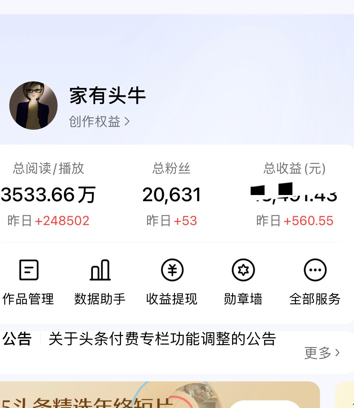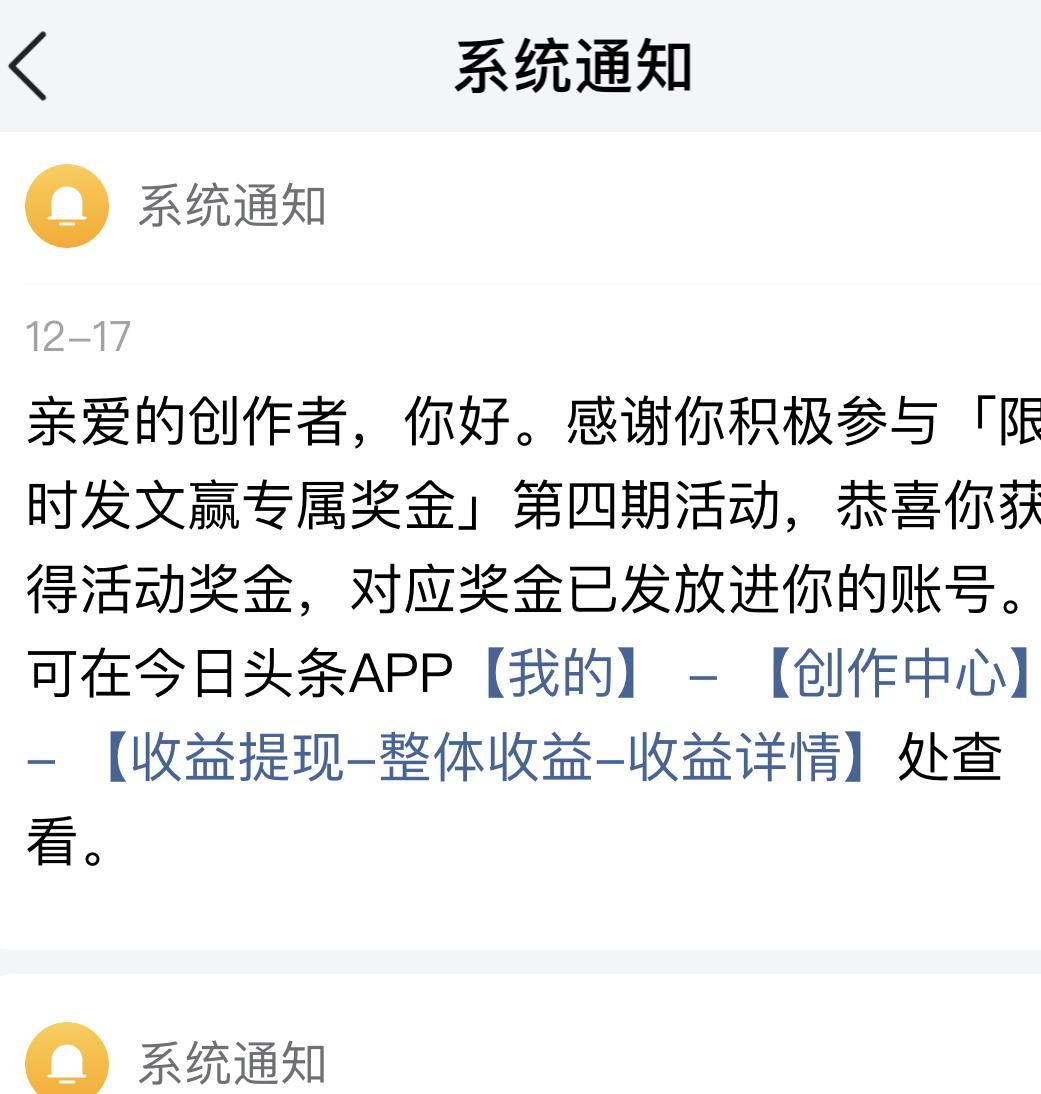 连着两次“头条新锐创作者”限时发文活动都过了50万阅读量 上星期是106万,这个星期是69万!过5万/33,20万/166,50万/500,自己能拿两次最高奖励,想想:尽力了。 本人不擅聊天,很少回复更少去评论别人,所以单价低,主要是时间问题。来头条的初衷是想把所想到的觉得印象深刻的事写下来,或是把自己对某事某观点的内心感受及思想见解抒发出来,是一种自我情绪的排解方式。有人看更好,无人看亦坦然,不然,高手如林的头条,你还想咋样呢。 不过更喜欢在头条这张大圆桌去逛逛,坐坐,看一看来自五湖四海文友们的辛酸苦楚,以及文友笔下的万家灯火。写作这事吧,真的是随缘尽力就好,不怨不忧,不然你会厌倦的。很快就到2026年了,大家继续加油,笔耕不辍,总有收获的时候。