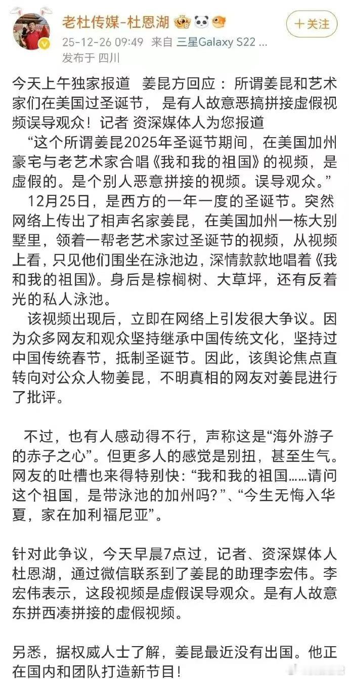 此生无悔入华夏,家住加利福尼亚?央视网昨天报道,圣诞节本该是美国一年中最欢乐的时刻,今年却成了“最贵圣诞节”。关税推高物价、压低进口,商家与民众被迫为关税买单。总之,这个节美国人过得不太舒心美国人过得舒不舒心我不知道,但网上一段视频显示,姜昆老师和他的老艺术家朋友们过得可太舒心了。圣诞节前夕,美国的豪宅里,炉火熊熊,一群老艺术家们围坐在一起,姜昆老师即兴伴奏,他们一起唱起了《我和我的祖国》。他们的快乐,衬托得因关税大战而要花更多钱买中国进口圣诞树的美国人,更加愁云惨雾。圣诞节,在美国,唱“我和我的祖国,一刻也不能分割”,这反差的一幕,让很多网友觉得甚是讽刺:“中国赚钱美国花,我是人民艺术家。”“洋装虽然穿在身,我薪依然中国薪。”“喝着红酒唱红歌,我家就在芝加哥。”“字正腔圆中国话,家住加利福尼亚。”不过,姜昆方面已经否认今年在美国过圣诞的说法,说这是恶意拼接的视频,还表示姜昆未出国,正在打造新节目。 姜昆的这个回应,就很有技巧。第一,说视频是拼凑的,但却拿不出证据,根本没有说服力。其实直接告诉大家这个视频是在什么时间、什么地点拍摄的,就可以一锤定音,但这么有力的证据都不愿拿出来,大家只能默认这背后有不好说的理由。第二,说姜昆最近没出过国,只能证明这个视频不是今年拍的,并不能证明姜昆之前没有在美国豪宅里唱《我和我的祖国》。第三,否认了一部分事实,好像就可以否认全部事实,好像别人就不能再对此发表任何意见,这个思路还真就能唬住一部分人。其实,只要直接否认视频里的人是姜昆,就说是AI生成的,就可以直接釜底抽薪。就算这个视频不是今年圣诞前夕拍的,只要视频里的人是姜昆老师,只要他在美国豪宅里唱过《我和我的祖国》,这个事情的性质就没有变化啊。而且,豪宅、泳池、大草坪,这么美好的生活,不正衬托出美国“斩杀线”以下的人们有多悲惨吗?姜昆老师本可以成为我们单边碾压美国的铁证,干嘛要急于辟谣呢?难道姜昆老师那边也觉得这样做不太好吗?但要我说,没什么不好。不但没什么不好,反而还有很多好处哩。我要为姜昆老师说几句公道话!第一,我认为,没有谁比姜昆老师更有资格唱《我和我的祖国》。我相信姜昆老师和那些老艺术家们唱《我和我的祖国》,是发自内心的,是真诚的。姜昆是曲协的领导,其他老艺术家估计也与他类似。他们享受着体制的红利,被公共资源豢养着,他们才是这个国家的受益者,所以他们有什么理由不爱祖国?只有这样的人唱“我最亲爱的祖国,你是大海永不干涸,永远给我碧浪清波,心中的歌”,才是最直观,最贴切的。第二,就算是姜昆老师过圣诞节,也是一种有益的示范。如果姜昆老师是在圣诞节前夜,在美国唱《我和我的祖国》,那我就更为他鼓与呼了。这最起码证明了,圣诞节不是洪水猛兽,甚至中国人在美国过圣诞节,也不是洪水猛兽,反而很温馨,很美好。也证明了,过圣诞节,并不耽误爱国,甚至会成为表达爱国情感的一个契机。相比之下,国内那些不允许学生过圣诞的高校,统计高调过圣诞学生的高校,是不是该以体制内的老艺术家为榜样,大大方方地过圣诞节,开开心心地过圣诞节?如果体制内的老艺术家都能打样过圣诞节了,那我们还有什么理由反对过圣诞节?这难道不是很有益的示范吗?第三,老艺术家在美国享受美好生活,是为很多人指明了方向。不管姜昆老师是不是在圣诞节前夕在美国豪宅唱《我和我的祖国》,只要他在美国享受过美好生活,其实就是一种指引。据说,姜昆老师也把女儿送到国外读书,先是去了澳大利亚读高中,后去美国读大学,女儿近年来也在美国发展,姜昆老师还经常去美国看望自己的女儿。这更是一种指引。你不要看老艺术家说了什么,讴歌了什么,而要去看他们做了什么。你别看他们说什么对圣诞节“无感”,倡导抵制洋节,但他们会老老实实送儿女去美国。别听有些人鼓励大家去柬埔寨旅游,警惕赴日旅游,这些口号你都可以不用当真,跟着老艺术家们的脚步,准没错。你可以不相信他们的人品,但不要怀疑人家的眼光。只是有个小建议,下次如果还有这种离岸爱国的时刻,还是换首歌吧,在大洋彼岸唱“我和我的祖国,一刻也不能分割”,多少还是有点违和的。