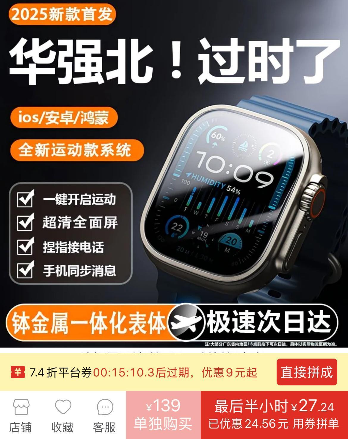 半夜刷拼多多 华强北山寨的苹果表已经干到了20几块[捂脸][捂脸] 问老婆要不要来一块 因为她带正品6000多apple watch 晚上也是戴着记录睡眠 她回答27块你敢戴着睡觉啊,不怕辐射吗 要买就买正品的,因为正品对健康有危害,如果证实苹果公司可以赔偿你三辈子不愁吃穿。 假的有问题国内奔走跑证明得跑一辈子[捂脸][捂脸] 说的好像也对[捂脸]