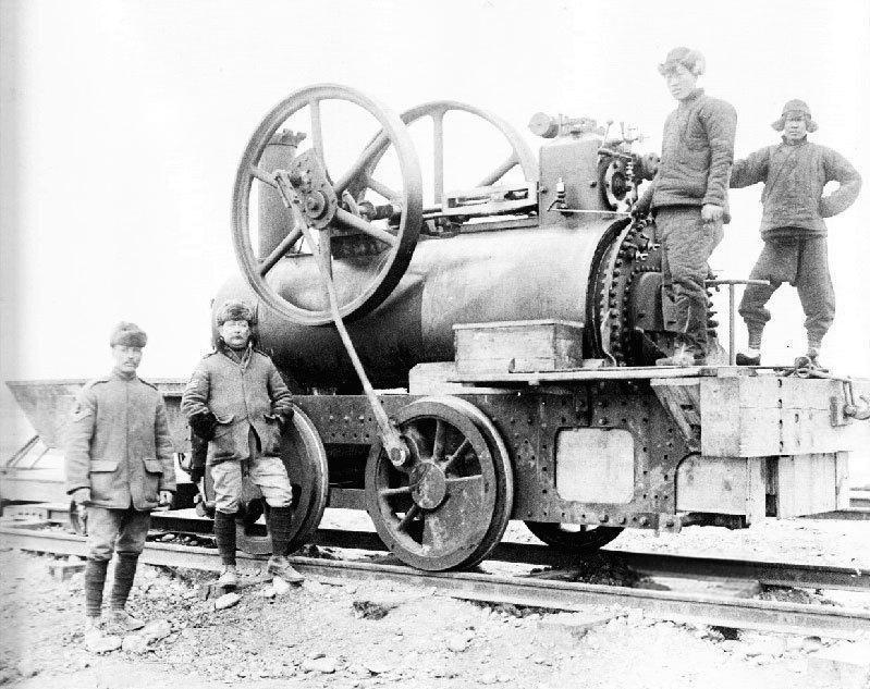 1881年,唐胥铁路上,这是中国工人自主制造的第一台蒸汽机车。 1881年,为解决开平煤矿的煤炭运输问题,清政府批准修建唐山至胥各庄的铁路;因清廷初期反对使用蒸汽机车,最初用骡马牵引车厢,后工人自主尝试制造蒸汽机车。 这台机车由开平煤矿的中国工人参照外国机车图纸,利用煤矿的机械车间设备打造而成,机车总重约13吨,牵引力约百吨;它是中国自主制造的第一台蒸汽机车,标志着中国近代机械制造与铁路运输业的开端。