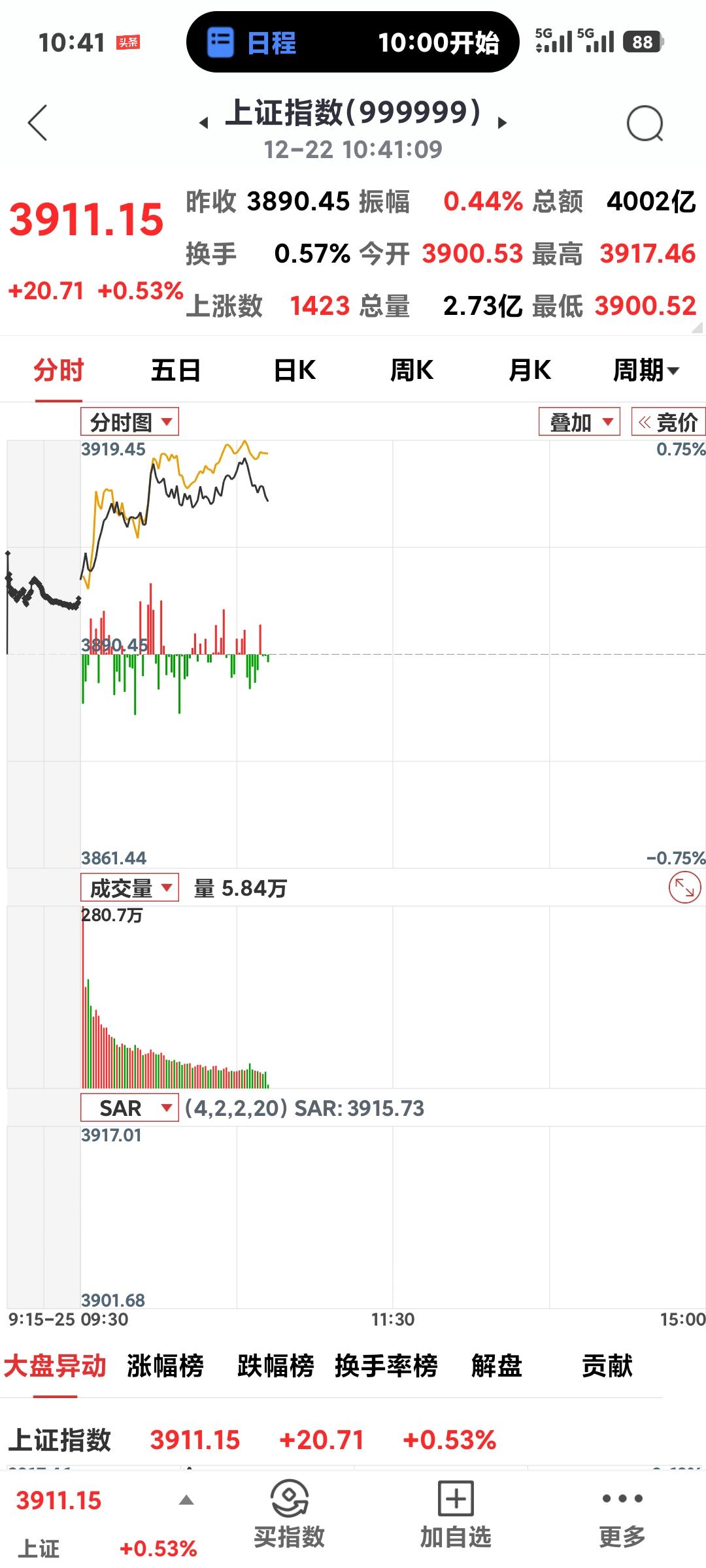 大盘强势收红 今日高开高走,开盘3900点,收盘3917点,大涨