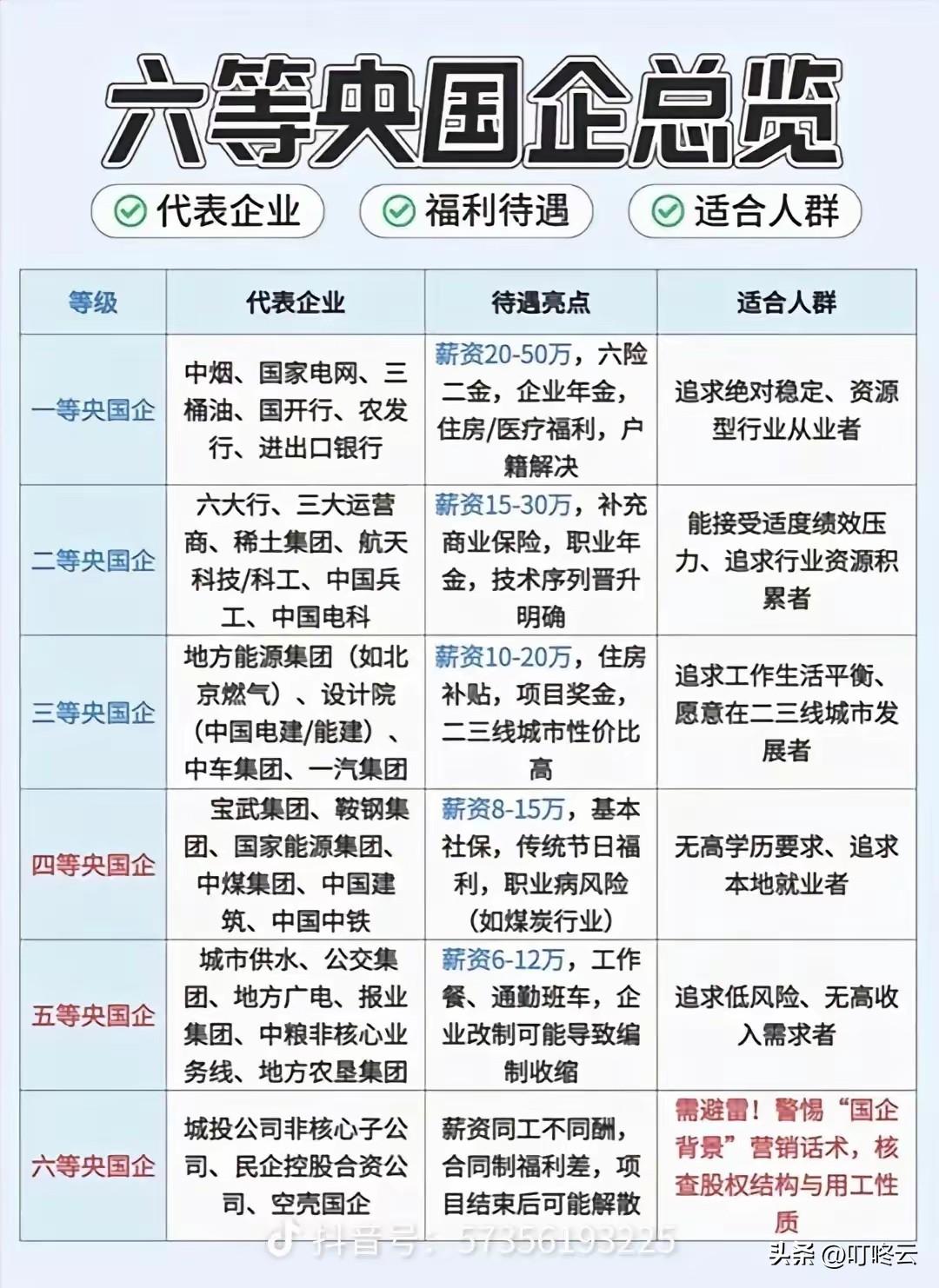 干货满满!央国企招聘薪资待遇6个等级排行榜汇总揭秘!一图看懂,职业规划!央国企招聘要求和岗位薪酬情况,各种各样,千差万别,不尽相同。我们以求职者的视角看待问题,列举各等级的代表企业,福利待遇,适合人群详解!速速围观揭秘详细内容![点亮平安灯][点亮平安灯][招财进宝][招财进宝] 欢迎关注@叮咚云 将优先为粉丝职业规划指导,1对1咨询是付费服务,为你定制最适合的就业择业方案!欢迎留言交流讨论。[来看我][来看我] 免责声明:图片来自网络,仅供参考! 央国企求职 央国企招聘 央国企求职招聘国企待遇