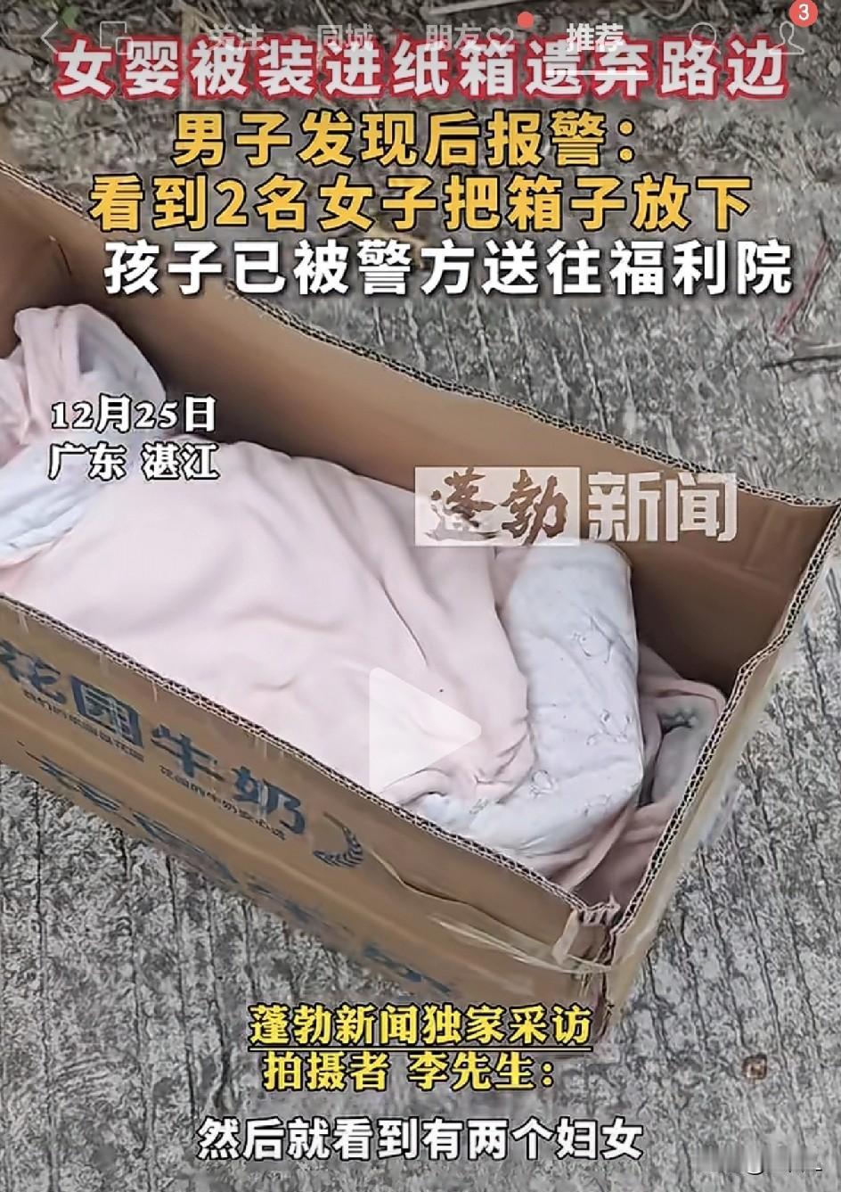 广东街头上演“纸箱快递女婴”!过路司机一打开惊呆了…… 见过快递送生鲜、送文件的,您见过“快递送婴儿”的吗? 12月25日,广东湛江街头就发生了这样荒诞又揪心的一幕——两个妇女骑电动车“配送”了一个纸箱到路边,里头装的不是商品,竟然是个活生生的女婴! 当天,开车路过的李先生正等红灯,忽然瞟见前方有俩妇女骑着电动车停下。两人动作麻利,从车上搬下一个纸箱往路边一放,头也不回拧电门就走,全程不过十秒。 “这啥操作?寄快递也不选个代收点?”李先生心里直嘀咕。越想越不对劲,他靠边停车,走上前去一探究竟。 纸箱一开,全场窒息:里面躺了个娃娃! 李先生凑近纸箱,轻轻掀开一看——嚯!一个裹得严严实实的小婴儿正安静躺着,旁边孤零零摆着一个奶瓶、一罐奶粉,再没别的东西。 寒冬腊月,冷风飕飕,孩子小脸冻得发红。李先生脑子“嗡”一声:“这哪是丢东西,这是丢孩子啊! 李先生一秒没犹豫,当场掏出手机报警。怕孩子冻着,他轻手轻脚把纸箱整个抱起来,放进自己车里,暖气开到最大。 “我也有孩子,看不得这个。”他在车里守着婴儿,一边等警察,一边盯着窗外,心里又气又急:什么样的狠心人,能把亲骨肉当包裹一样“扔”在路边? 警方很快赶到,小心翼翼接过孩子。目前女婴已被送往福利院暂时照料,吃喝有人管,保暖有保障,总算安全了。 可这事儿留下的疑问一串串: 俩妇女是谁?孩子父母在哪? 奶粉奶瓶都备了,怎么就不能再多想一步? 大冷天扔路边,是真以为纸箱能“保温”还是压根没想让孩子活? 消息一出,网友炸锅,评论区直接冲上热搜: “这操作太“地狱”!” “这是把孩子当‘到付件’了?地址还填‘路边’?!” “奶粉都准备了,却舍不得一点良心??” “给李先生点赞!救了孩子一命,好人一生平安!” “建议全城监控联动,必须把扔孩子的人揪出来!” 也有人苦笑提醒: “遗弃婴儿是犯罪啊姐姐!刑法写着呢!” “真养不起可以报警、找福利机构,这操作简直又坏又蠢!” 遗弃婴儿,法律可不答应!情节恶劣的,最高可判五年有期徒刑。 路边不是回收站,孩子也不是“不可燃垃圾”,这么一扔,扔掉的不仅是亲情,还可能把自己扔进牢里。 寒冬腊月,那个纸箱里装的本应是一个家庭的宝贝,却差点成了“街头废弃物”。幸亏遇到了心细又善意的李先生,否则后果不堪设想。 孩子不是物品,不能扫码寄件,更不该被“一键删除”。 如果真有难处,求助渠道永远比冷漠抛弃多一步。 目前警方已介入调查。我们等着真相,更等着那句迟到的“对不起”。 最后呼吁:如果身边遇到类似情况,请学李先生——先保护,再报警。你的一次留心,或许能拯救一个孩子的一生。 素材来源:直播海南、蓬勃新闻,侵联删!